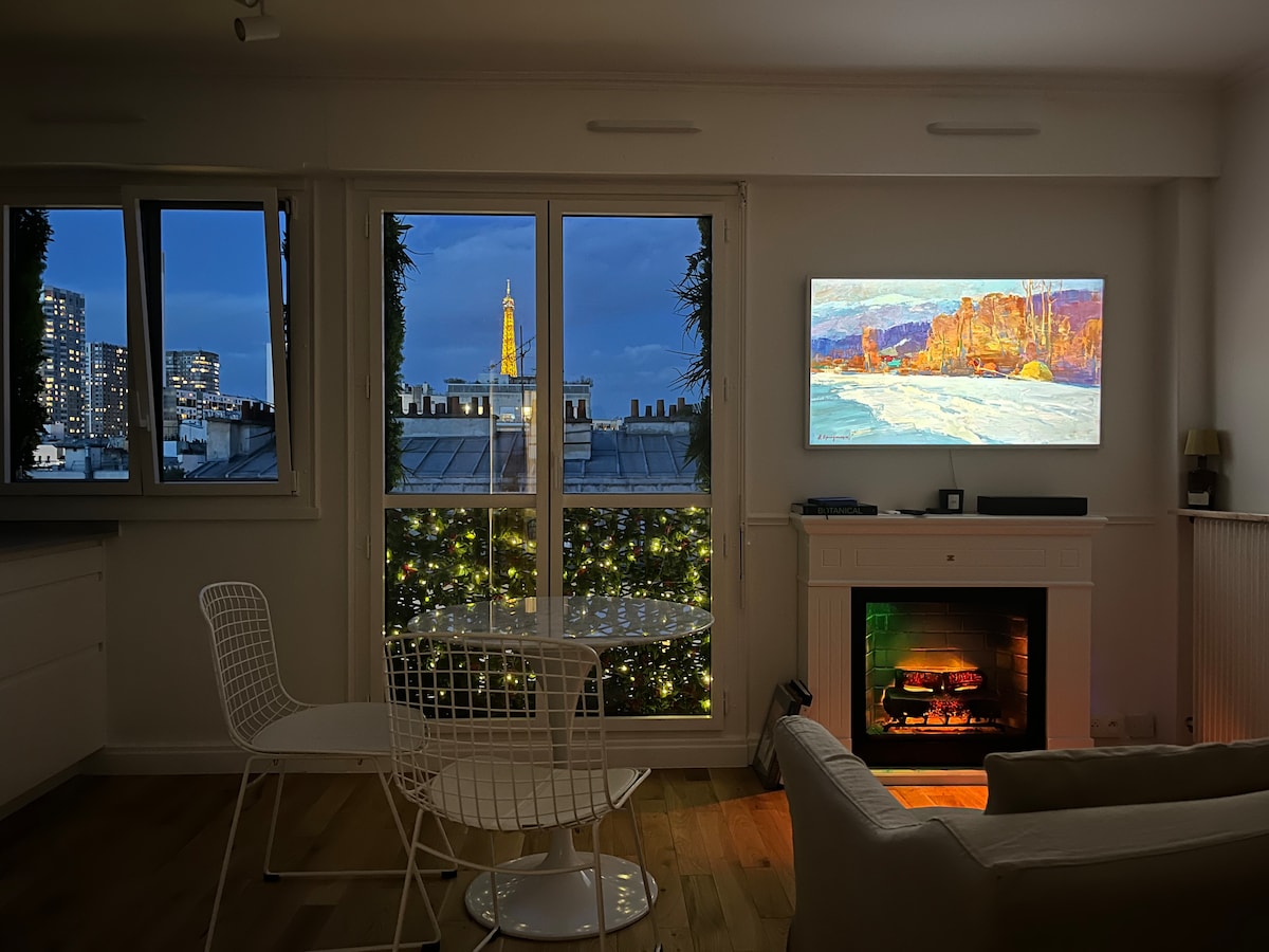 Fully renovated and refurbished studio with the most amazing view of the Eiffel Tower and most Parisian monuments. Wake up to the breathtaking sight of the Eiffel Tower right from your queen-size bed. The large French windows and the balcony make the experience even more memorable. The studio is located 10 min walk from the Eiffel Tower and 4 min walk from Metro stations. The building is safe, and there are plenty of shops and restaurants in the neighborhood. A/C, High Speed broadband, Netflix