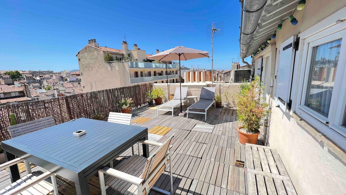 Ευρύχωρο, φωτεινό και διασταυρούμενο κατάλυμα, με θέα στη θάλασσα, 2 μπαλκόνια (στην πλευρά του δρόμου και στην αυλή), στον τελευταίο όροφο (χωρίς ασανσέρ). 2 υπνοδωμάτια με διπλά κρεβάτια και έναν καναπέ-κρεβάτι στο σαλόνι. Σε απόσταση αναπνοής από το Parc Longchamp, 5 λεπτά από το Friche de la Belle de Mai, 15 λεπτά από το Παλιό Λιμάνι, 15 λεπτά με τα πόδια από τον σταθμό St Charles (τρένα). Σούπερ μάρκετ, φούρνος, φαρμακείο στους πρόποδες του κτιρίου. Λεωφορείο και τραμ δίπλα. Metro 10mn walk.