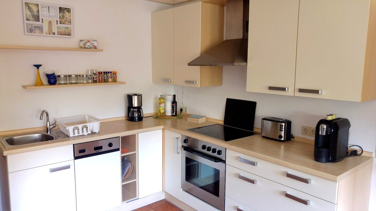 Διαμέρισμα 60 m² με πανοραμική θέα – για έως 4 επισκέπτες • Υπέρδιπλο κρεβάτι, καναπές-κρεβάτι, πτυσσόμενο κρεβάτι (κατόπιν αιτήματος), βρεφικό κρεβάτι • Πλήρως εξοπλισμένη κουζίνα: εστίες, φούρνος, βραστήρας, καφετιέρα, πλυντήριο πιάτων, ψυγείο, τηλεόραση • Υψηλής ποιότητας κλινοσκεπάσματα, πετσέτες, καφές και τσάι • Μεγάλη βεράντα με ξαπλώστρα, θέα στη φύση Εξαιρετική τοποθεσία: • 5 λεπτά με το αυτοκίνητο / 30 λεπτά με τα πόδια από το κέντρο του Idstein • Τα μονοπάτια πεζοπορίας ξεκινούν από την πόρτα • 20 λεπτά από το αεροδρόμιο της Φρανκφούρτης και το Βισμπάντεν • 2 χλμ. από τον αυτοκινητόδρομο • Κοντινή παιδική χαρά και κορυφαίο εστιατόριο με ψησταριά