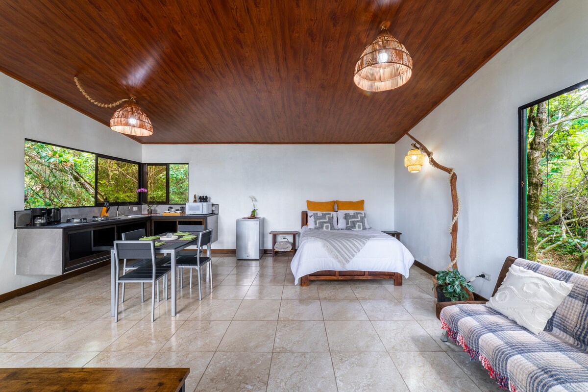 Το Sunset Hill βρίσκεται κοντά στην πόλη της Σάντα Έλενα, περίπου 20 λεπτά με τα πόδια ή 5 λεπτά με το αυτοκίνητο (συνιστάται αυτοκίνητο). Επίσης, το διάσημο ορεινό δάσος Monteverde και οι περισσότερες από τις περιηγήσεις βρίσκονται 10 έως 20 λεπτά μακριά. Το σπίτι διαθέτει πλήρως εξοπλισμένη κουζίνα, ιδανική για ζευγάρια! Διαθέτει 1 υπνοδωμάτιο με υπέρδιπλο κρεβάτι. Το σπίτι βρίσκεται στη μέση μιας πλούσιας ιδιοκτησίας 5+ στρεμμάτων, η οποία εξασφαλίζει απόλυτη ιδιωτικότητα και ηρεμία. Η σουίτα Honeymoon Gulf View είναι ένας αξέχαστος χώρος διαμονής με μαγευτική θέα.