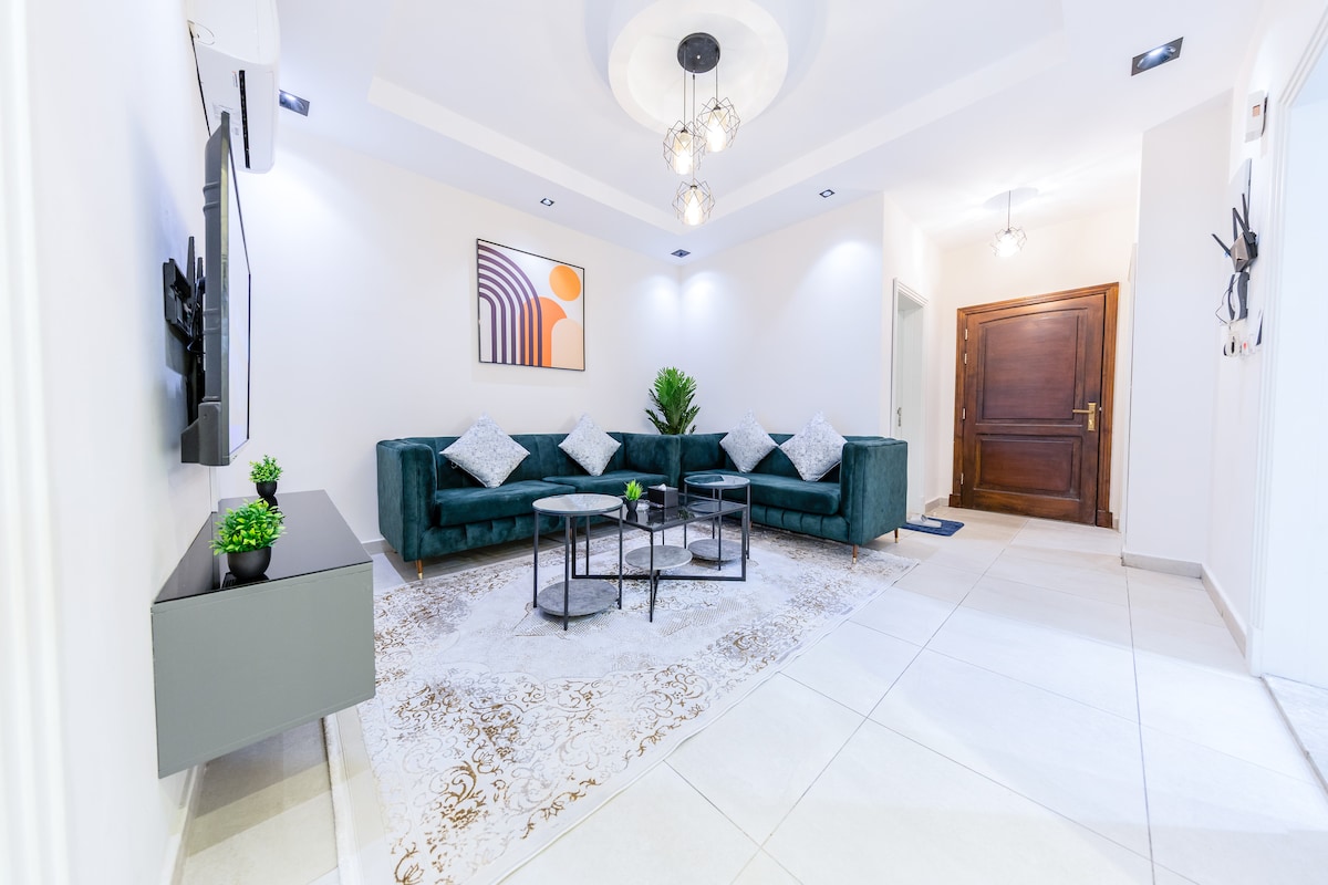 Χαλαρώστε σε αυτόν τον μοντέρνο και κομψό χώρο - Ένα σαλόνι με σαλόνι με χαλαρωτική συνεδρία, ένα κύριο υπνοδωμάτιο, μια γωνιά καφέ και ένα πλήρες μπάνιο. Διαθέτει έξυπνη οθόνη 70 ιντσών με συνδρομή Netflix και παρακολουθήστε VIP και IPTV για να απολαύσετε παιχνίδια, ταινίες και σειρές, καθώς και δωρεάν γρήγορη πρόσβαση στο διαδίκτυο. Διαθέτει μια τοποθεσία κοντά σε όλες τις υπηρεσίες και στις καλύτερες γειτονιές της πόλης της Τζέντα . Hayakum Allah, οι επισκέπτες μας στο δεύτερο σπίτι σας