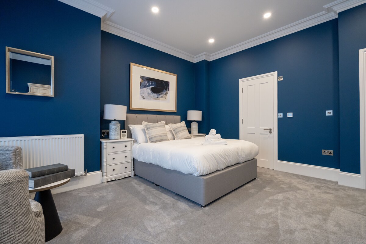 Be our guest in 650 sqft of luxury, perfect for families, groups, or special occasions. The suite includes a two rooms connected by a shared lounge. Sleeps 4 in two extra-large super-king beds. Up to 2 additional beds (fold-out or sofa) can be added on request for children or small adults (£27 each). The master bedroom features a separate dressing area, freestanding bathtub, and walk-in shower. The second bedroom has an en-suite shower and can be set up as a twin on request. AA 4* Gold Rated.