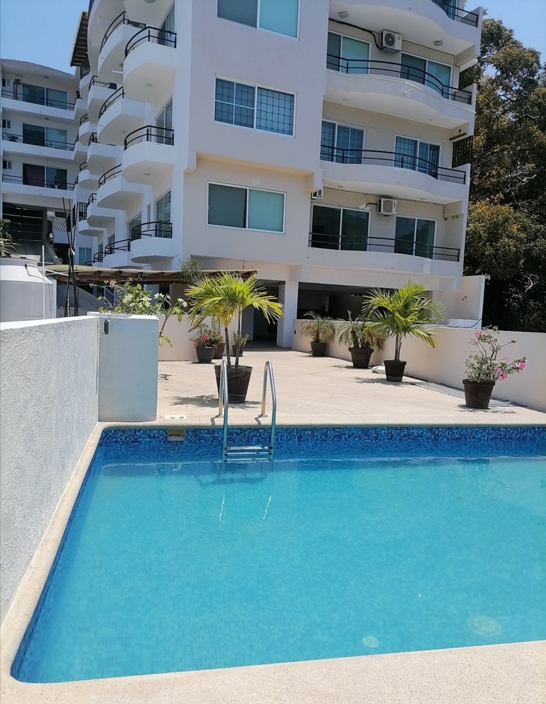 Apartamento con playa privada y con una hermosa vista al mar, con albercas y chapoteadero. El departamento esta bien iluminado, con ventiladores y aire acondicionado en las recamaras y áreas comunes, wifi, ventanales con salida hacia el balcón para siempre tener la hermosa vista de la playa y a su vez que el departamento este bien iluminado con luz natural durante el día, cocina y comedor totalmente equipados, sala con televisión, dos terrazas con sillas y mesas para reposar viendo el paisaje.