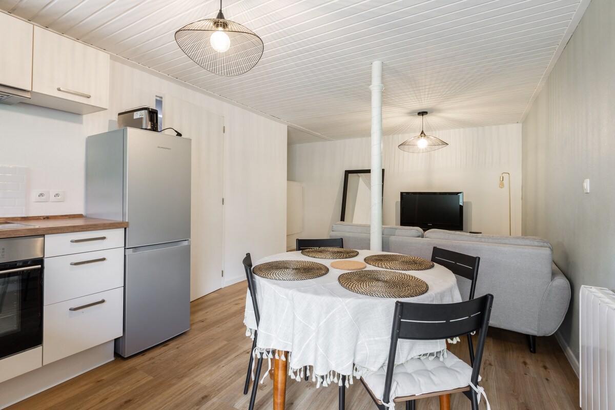 Όμορφο φωτεινό στούντιο 34 τ.μ. σε ήσυχο δρόμο μονής κατεύθυνσης με εξοπλισμένη κουζίνα (2 εστίες μαγειρέματος, φούρνος μικροκυμάτων, βραστήρας, τοστιέρα και καφετιέρα dolce gusto), μπάνιο, βεράντα 12 τ.μ. και δωρεάν ιδιωτικό πάρκινγκ. Το στούντιο είναι (με αυτοκίνητο): - 15 λεπτά από το κέντρο της Στρασβούργου - 6 λεπτά από το αεροδρόμιο του Στρασβούργου Το χωριό εξυπηρετείται από τα μέσα μαζικής μεταφοράς (βλέπε στην καρτέλα "Πού βρίσκεται το κατάλυμα" και "Μάθετε περισσότερα")