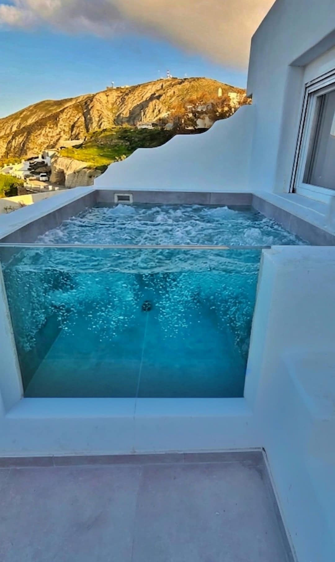 Anemos suite is located in Akrotiri overlooking the caldera and the volcanic islands . It is a suite with Private, Infinity heated Cave style plunge pool with Jet system and private patio. There is a king size bed that can accommodate two person. Daily breakfast is included and served in your suite . There is a cleaning service included. Inform us about your arrival details in advance , we can arrange a taxi/transfer for you.