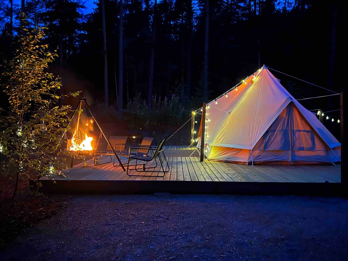 Ζήστε τη φύση από κοντά με την πολυτέλεια της σκηνής. Εδώ ισχύει μόνο χαλάρωση, σε glamptelt ή φωτιά σε όμορφο περιβάλλον. Οι ευκαιρίες για πεζοπορία είναι πολλές, με τα πόδια ή με κανό και με καλό ψάρεμα πέστροφας. Οι σκηνές έχουν στηθεί το 2024 και είναι επιπλωμένες με ένα διπλό κρεβάτι, καρέκλα, τραπέζι και ξυλόσομπα με εγκαταστάσεις μαγειρέματος. Υπάρχει ένα διπλό κρεβάτι στη σκηνή, αλλά υπάρχει χώρος για περισσότερα στο πάτωμα, αν θέλετε. Έως 8 άτομα.