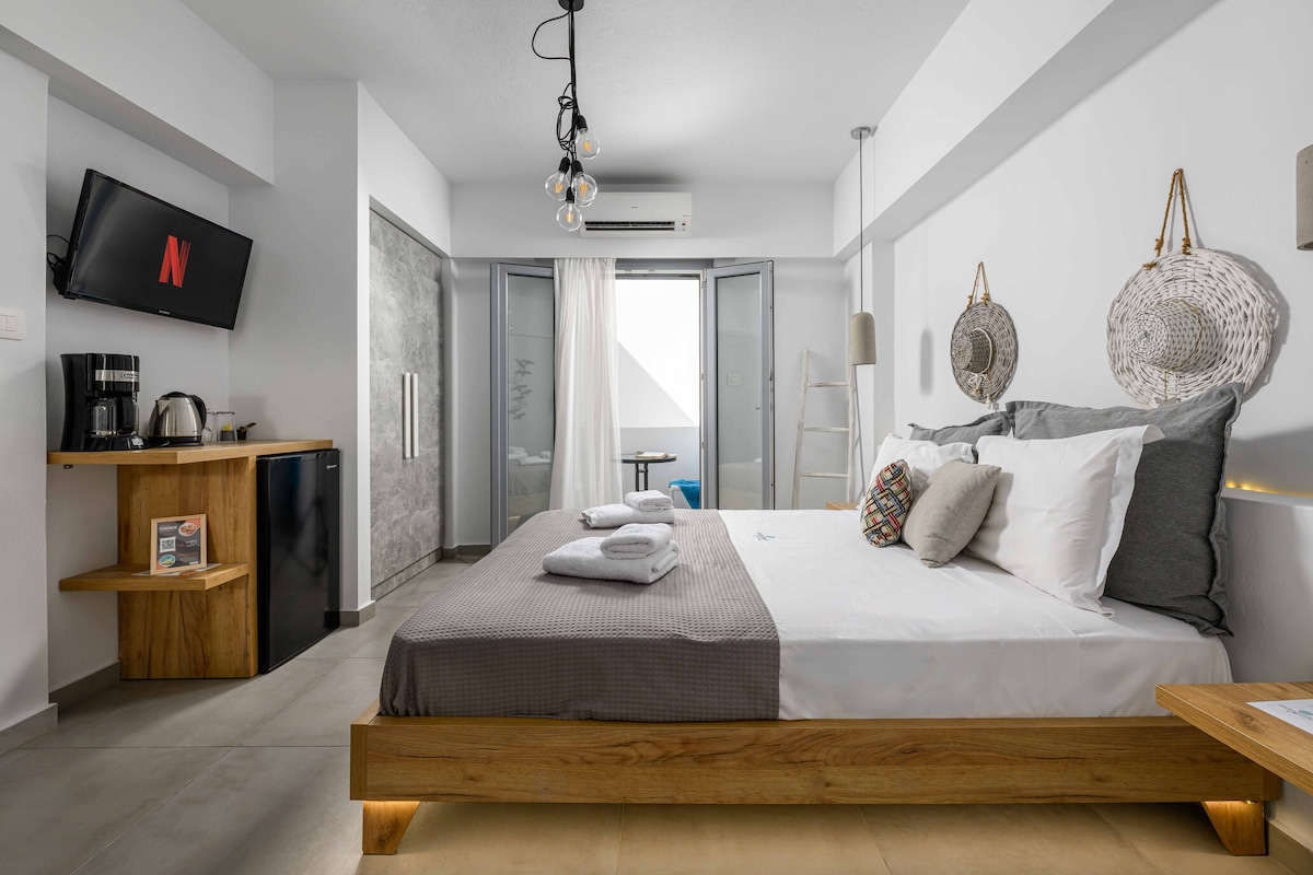 Χαλαρώστε στο μπαλκόνι σας και απολαύστε την εκπληκτική θέα στη θάλασσα και την πισίνα. Το ανώτερο δωμάτιο στον επάνω όροφο της Νάξου έχει ένα διπλό κρεβάτι, ιδιωτικό μπάνιο και ιδιωτικό μπαλκόνι. Δωρεάν Wi-Fi, καθημερινή υπηρεσία καθαρισμού και κοινόχρηστη πισίνα. Καμία λεπτομέρεια δεν παραβλέπεται σε αυτό το γοητευτικό και πολυτελές μέρος για να μείνετε.