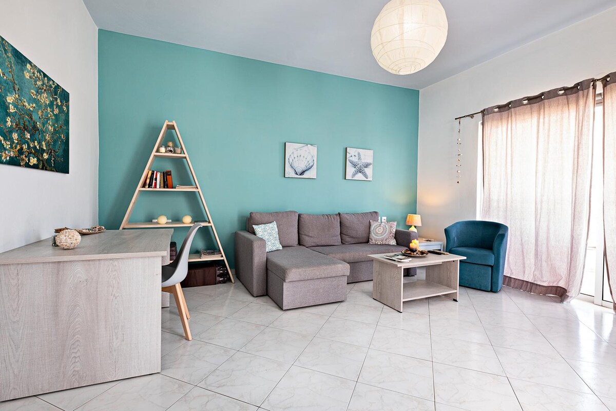 A sunny corner apartment just five minutes on foot from city center and Nea Chora beach. The famous Old Venetian Harbor of Chania is less than ten minutes away on foot and the Agora market in the city centre is about 10 minutes walk.The lovely beach of Nea Chora, which is a blue flag beach, is perfect not only for swimming but also for evening strolls along the promenade, which is famous for its excellent restaurants with sea food, Mediterranean and Cretan traditional dishes.