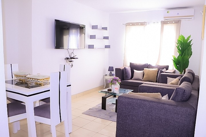 Επιπλωμένο διαμέρισμα Σε ένα ασφαλές κτίριο με βίντεο παρακολούθησης στον κοινόχρηστο χώρο. Περιλαμβάνει δύο υπνοδωμάτια, συμπεριλαμβανομένης μιας κύριας σουίτας, σαλονιού, κουζίνας και μπαλκονιού εξοπλισμένο με όλες τις ανέσεις (κλιματιστικό, ανεμιστήρας, επαγωγικό ηλεκτρικό πλυντήριο εστιών). Βρίσκεται στο ΑΘΛΗΤΙΚΌ ΣΥΓΚΡΌΤΗΜΑ YOPOUGON.