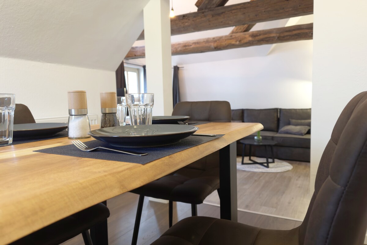 Spacious old town flat with a stylish mix of historical elements and modern comfort. Enjoy a four-poster bed, lots of light, high ceilings and a spacious living area with a view of the half-timbered houses - perfect for romantic or cultural stays. ☆ Fast WiFi ☆ Smart TV ☆ Free hotel-quality bed linen and towels ☆ Free care products from PRIJA ☆ Fully equipped kitchen ☆ Nespresso coffee machine ☆ Free coffee and tea products ☆ King-size bed