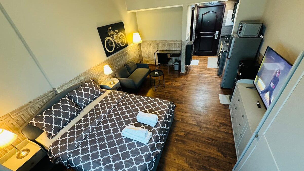Πολυτελές επιπλωμένο στούντιο με μοντέρνο σχεδιασμό, με άνετο κρεβάτι, κομψό καθιστικό, πλήρως εξοπλισμένη κουζίνα και κομψό μπάνιο με παροχές ξενοδοχείου. WiFi υψηλής ταχύτητας και εξαιρετική τοποθεσία κοντά σε εστιατόρια και αξιοθέατα, ιδανικό για σύντομες ή μεγάλες διαμονές.