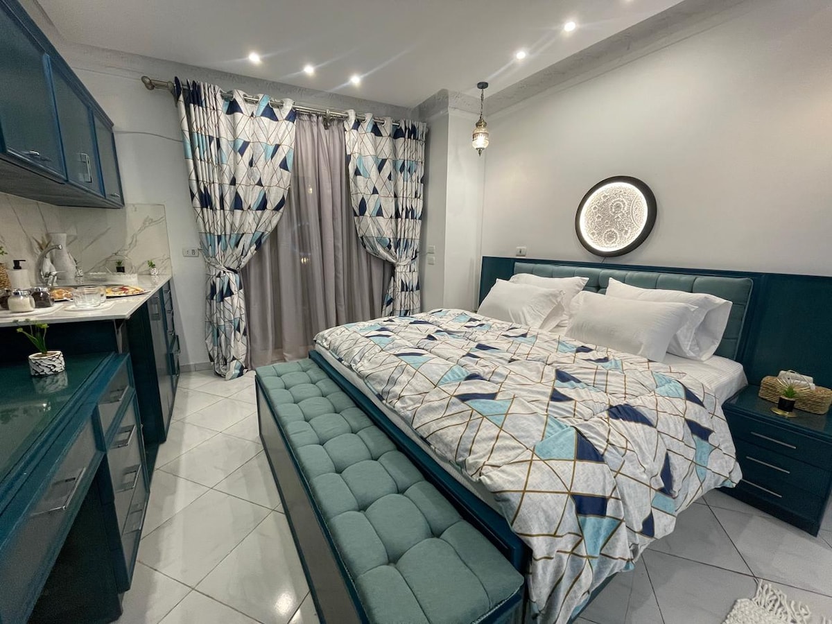 Καλώς ήρθατε στην πολυτελή απόδρασή σας στη Γκίζα! Αυτό το μοντέρνο στούντιο είναι τέλεια προσαρμοσμένο για να προσφέρει τόσο το στυλ όσο και τη λειτουργικότητα, συγχωνεύοντας τον σύγχρονο σχεδιασμό με στοιχεία εμπνευσμένα από την πλούσια φαραωνική κληρονομιά. Αυτός ο χώρος, που βρίσκεται κοντά στις Μεγάλες Πυραμίδες και στο Μεγάλο Μουσείο, είναι το ιδανικό καταφύγιο για όσους εκτιμούν την άνεση μέσα στον πολιτισμό.