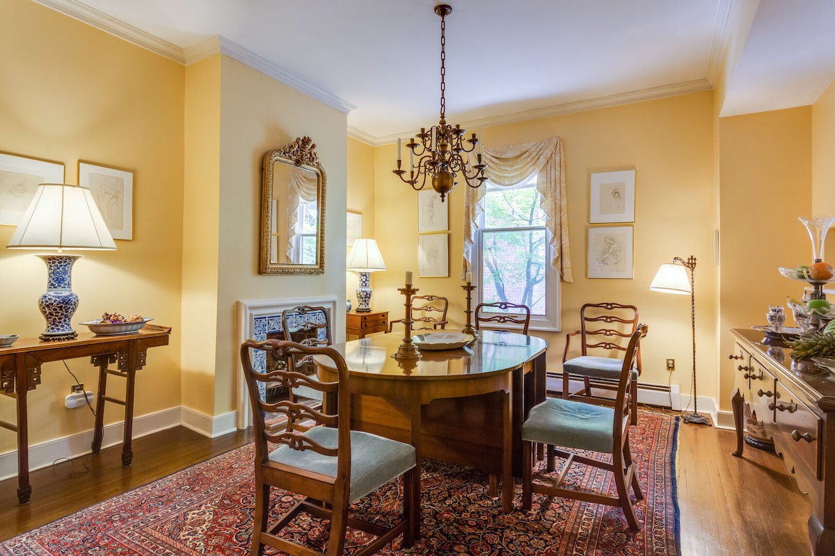Private entry, quiet, historic, 3 blocks to Downtown Mall. 2nd floor suite, wood floor, queen bed; loveseat, electric fireplace, study w desk, 2 adjoining bathrooms-1 compact shower-one 4' clawfoot tub. Extra bedroom - $35/night. Private coffee room/library, compact refrigerator, microwave, ceramic cookware, cutting board, full dish set, flatware, wineglasses, electric kettle, pour-over coffee Chemex; locally ground coffee, bakery breakfast bread, NO KITCHEN or stove-Support local restaurants!