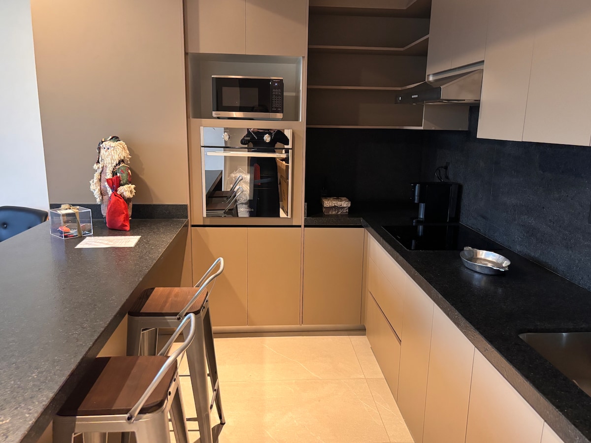 Omega Black, New Apartment 7 min from Colosio Av. Amazing view from 8th floor, TV 75", 65" and 58", private terrace, Optional AC for main bedroom $300 per night (included in fair). 24 Hr security guard, private parking, and 2 elevators. Currently Building ammenities are restricted for Airbnb. Commercial center with Starbucks and Gold Gym at one side of the tower. One car allowed.