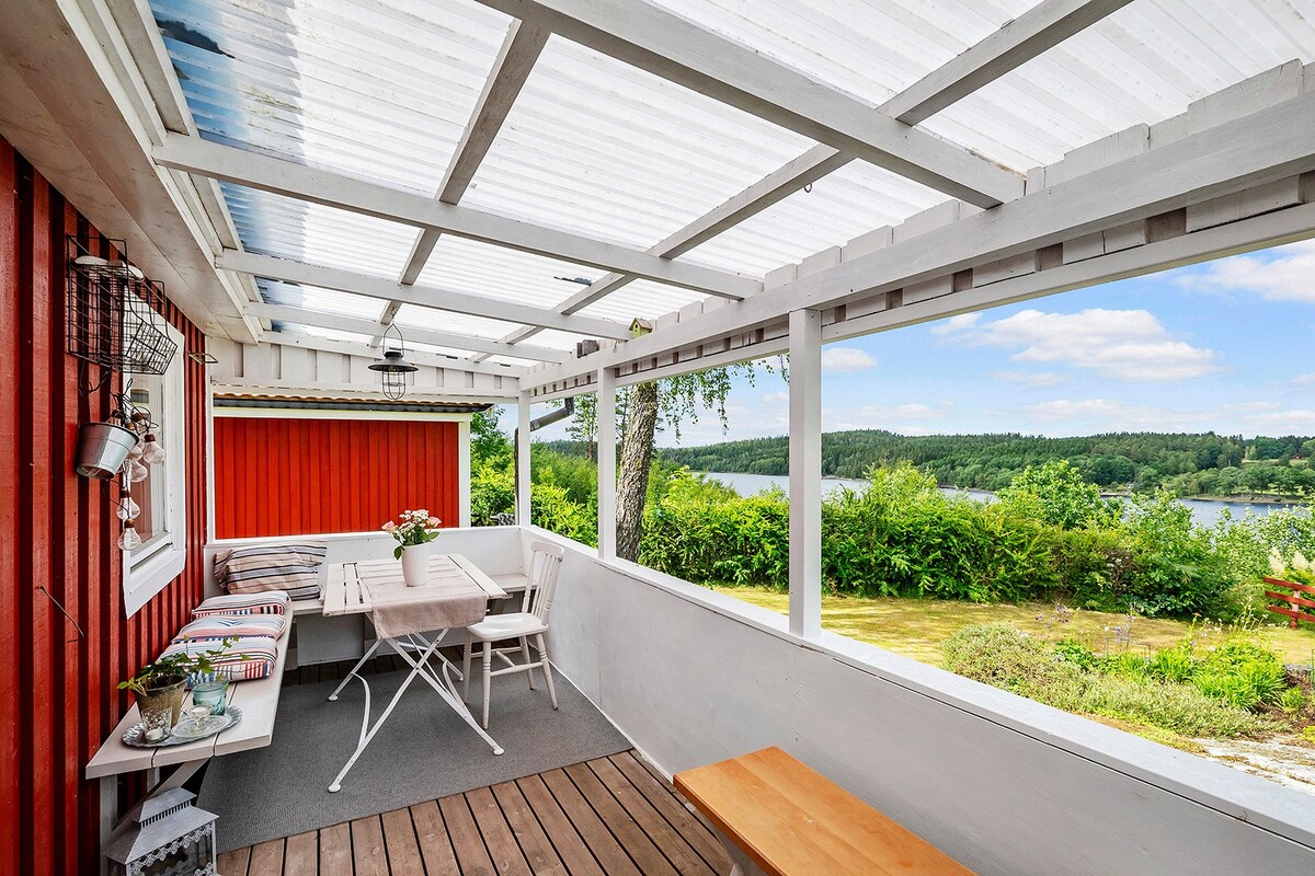 Röd stuga med sjöutsikt