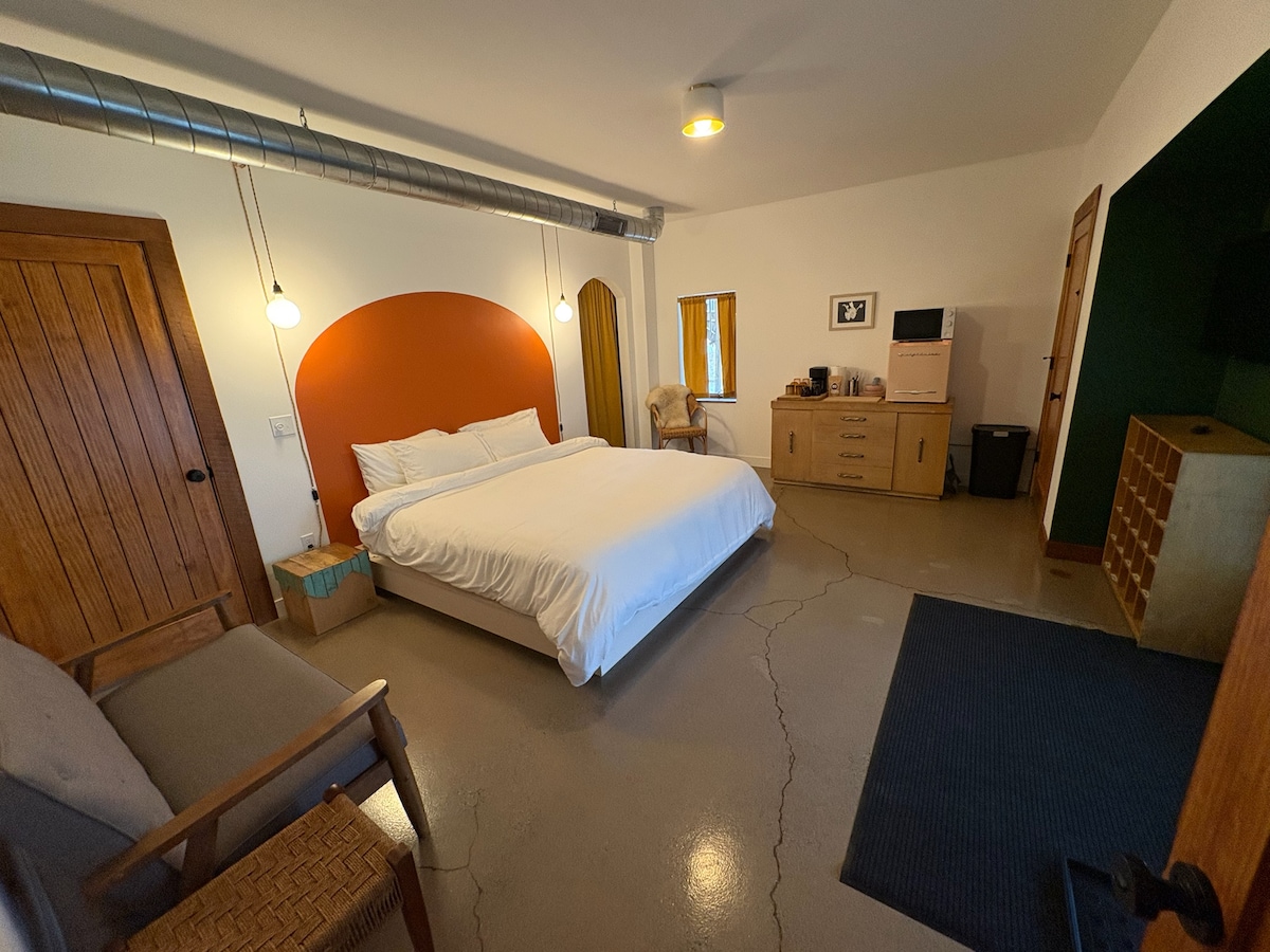 Escape to The Pink Room at OHC Blueprint, a thoughtfully designed private studio filled with vintage charm. The space features a comfortable king bed and a distinctive pink tiled bathroom. The main room also includes a TV, mini-fridge, microwave, and coffee maker, giving you everything you need for a relaxing and convenient stay. Spend evenings soaking in the luxurious hot tub, gathering around the fire pit, and enjoying the calm surroundings—ideal for a romantic or relaxing getaway.