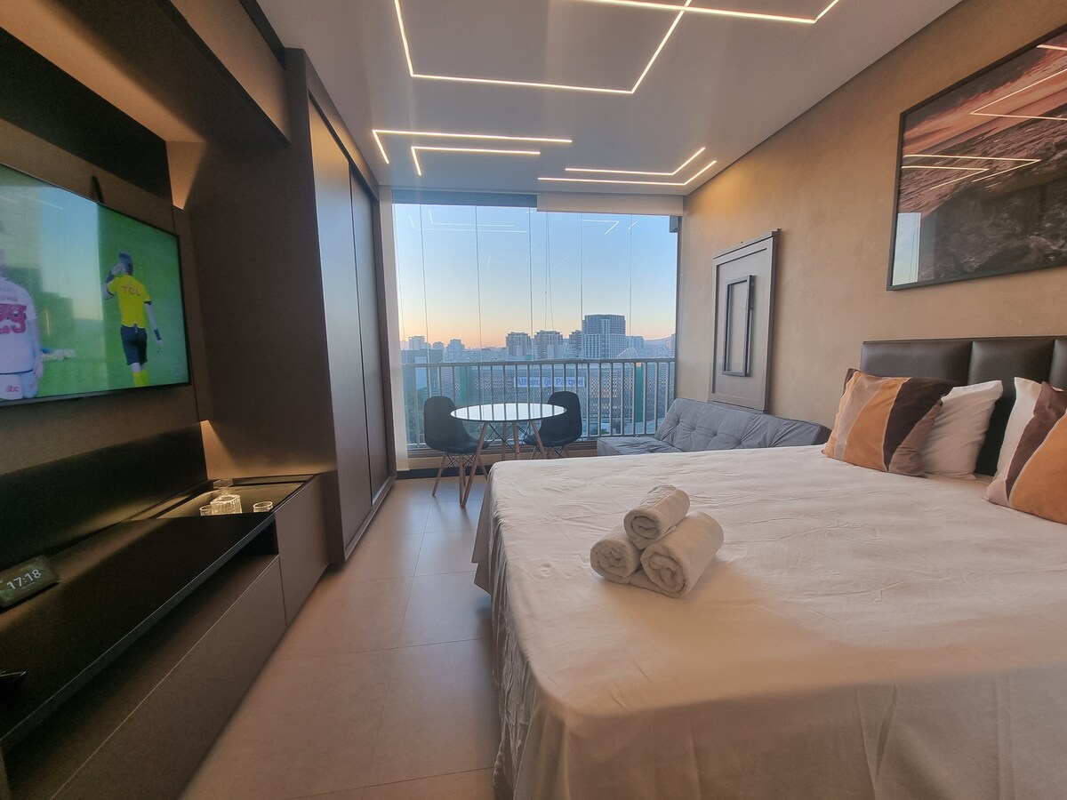 Ολοκαίνουργιο διαμέρισμα, με σύγχρονο στιλ, υψηλών προδιαγραφών και σε πολύ καλή τοποθεσία, με προνομιακή θέα στο Allianz Parque. Δίπλα σε εμπορικά κέντρα, διάφορες επιχειρήσεις, μέσα μεταφοράς, πάρκα, τουριστικά αξιοθέατα και επιχειρηματικά κτίρια. Το στούντιο είναι πλήρως εξοπλισμένο, με ένα άνετο διπλό κρεβάτι, έξυπνη τηλεόραση και ίντερνετ. Κουζίνα με όλα τα σκεύη, εστία, ψυγείο και φούρνο μικροκυμάτων. Με πάρκινγκ (περιστροφικό). Κοντά σε όλα, άνετα, ιδανικά για να ζήσετε φανταστικές στιγμές.