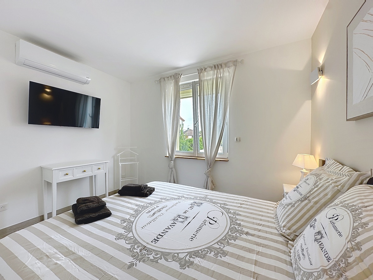 Διαμέρισμα ισογείου, κλιματιζόμενο, εντελώς ανεξάρτητο (αυτόματο check-in) και περιλαμβάνει ένα μεγάλο υπνοδωμάτιο: υπέρδιπλο κρεβάτι με τηλεόραση 40", μπάνιο με τουαλέτα, ανοιχτή κουζίνα σε σαλόνι με μετατρέψιμο καναπέ 1,60 μ. καλής ποιότητας με αφρό μνήμης. 1 παράθυρο με θέα σε εξωτερικό χώρο. Το κατάλυμα διαθέτει 2 θέσεις στάθμευσης σε κλειστή αυλή (βίντεο). Το κατάλυμα διαθέτει λίμνη όπου μπορείτε να περπατήσετε και να δείτε🦆🐿️ σκίουρους. Παρέχουμε σεντόνια και πετσέτες.