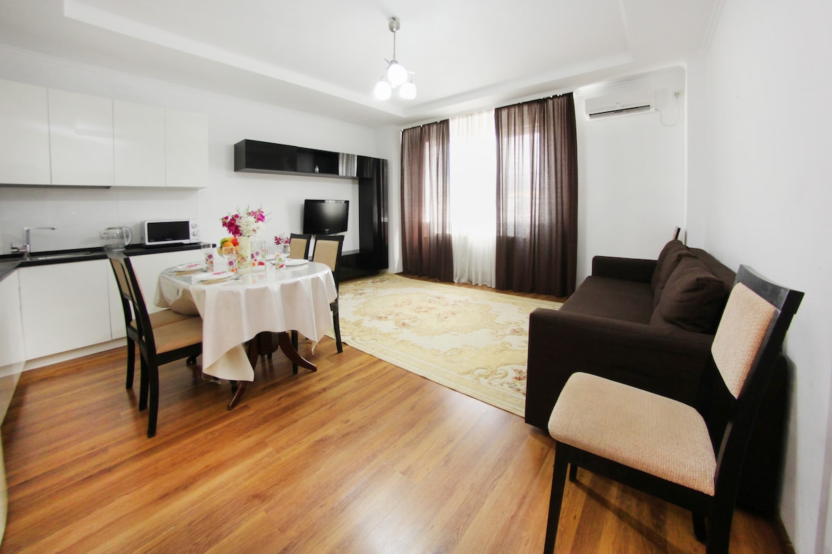 Καλώς ήρθατε στο κομψό, άνετο διαμέρισμά μας! Βρίσκεται στην καρδιά του Αλμάτι. Το διαμέρισμά μας έχει εκπληκτική θέα στο Rixos Almaty. Το διαμέρισμα είναι ολοκαίνουργιο, με συνολικό εμβαδόν 57 τ.μ., περιλαμβάνει 2 δωμάτια και μπορεί να φιλοξενήσει άνετα έως 3 άτομα. Βρίσκεται σε ένα ιστορικό κτίριο με οροφές 3 μέτρων, γεγονός που του προσδίδει μια ιδιαίτερη γοητεία. Το διαμέρισμα διαθέτει όλα όσα χρειάζεστε για μια μακρά διαμονή. Κοντά στο σπίτι υπάρχουν καταστήματα, πάρκα, εστιατόρια και τα κύρια αξιοθέατα της πόλης