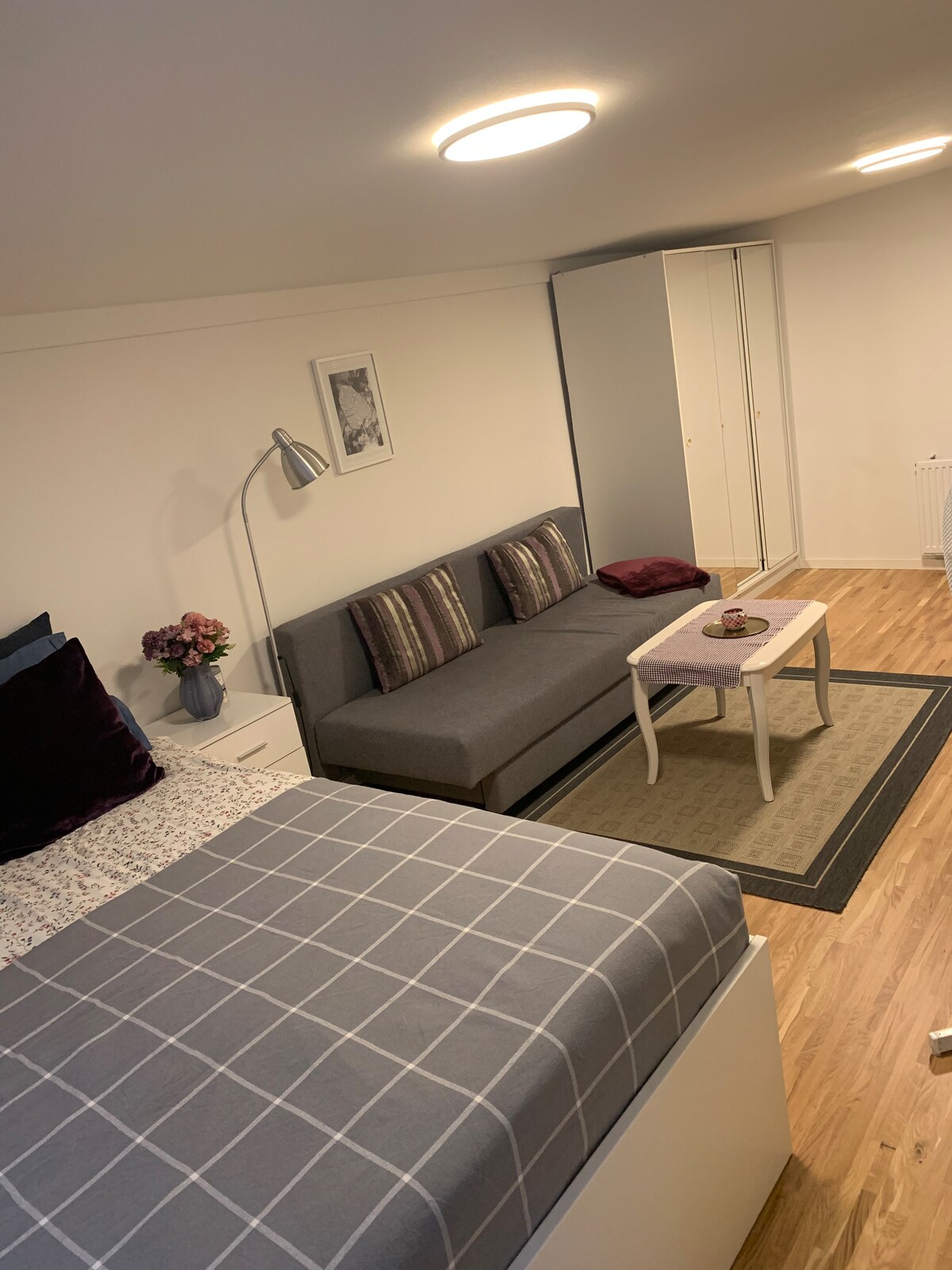 Φρέσκο και νεόκτιστο στούντιο με πολύ ηλιακό φως. - Υπέρδιπλο κρεβάτι 210x210 εκ. - Καναπές-κρεβάτι 145x200 εκ. Ολόκληρο το διαμέρισμα είναι 55 τ.μ. και όλο δικό σας κατά τη διάρκεια της διαμονής σας. - Δωρεάν πάρκινγκ στον δρόμο ακριβώς έξω από το σπίτι. - Παντοπωλείο σε κοντινή απόσταση. - 2 σταθμοί λεωφορείων κοντά. 20-30 λεπτά με το λεωφορείο από το κέντρο της πόλης. - 15 λεπτά με το αυτοκίνητο από το κέντρο της πόλης. Αν έχετε οποιαδήποτε ερώτηση, μη διστάσετε να ρωτήσετε!