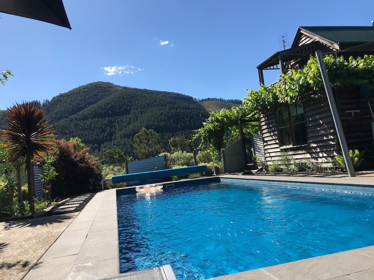 Welcome to our beautiful, light-filled 3-bedroom mountain retreat (Sleeps 6-8) Featuring warm timber ceilings, stunning views, and a spectacular enclosed pool. Located on the Great Alpine Bike Trail, it’s an easy walk/ride into Bright. Enjoy the lush, tranquil gardens with a BBQ pavilion for family. Space for everyone with a huge, comfy lounge, snug wood fire, and a Chef's kitchen. Enjoy sunset drinks on the terrace! Make forever memories here.