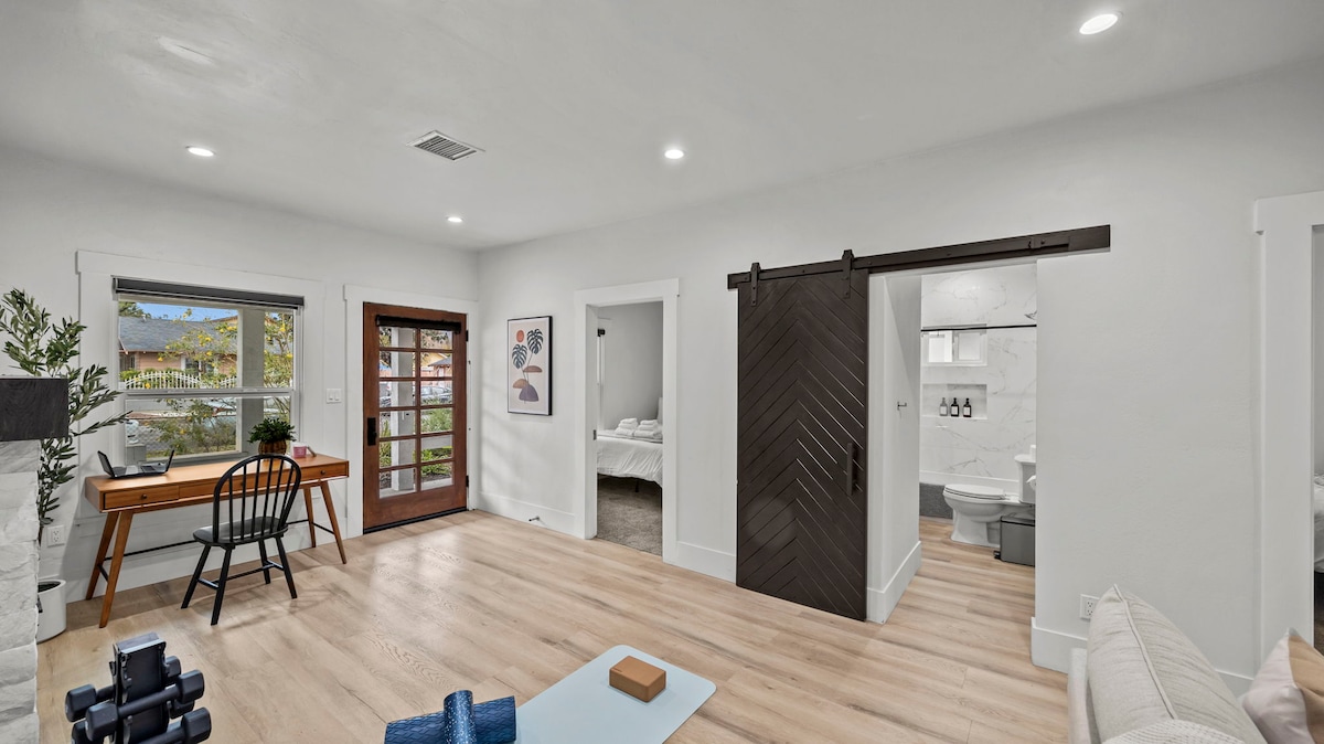 Our private 650 sq ft bungalow offers its own entrance, free parking, and the freedom to come and go as you please. Enjoy a bedroom with California King bed, living room with twin sleeper sofa, and a cozy back library stocked with books, games, and a full-size pullout sofa—perfect for 4+ guests! The space features a modern kitchen and in-unit washer for your convenience. Your ideal home away from home in a peaceful, self-contained retreat!