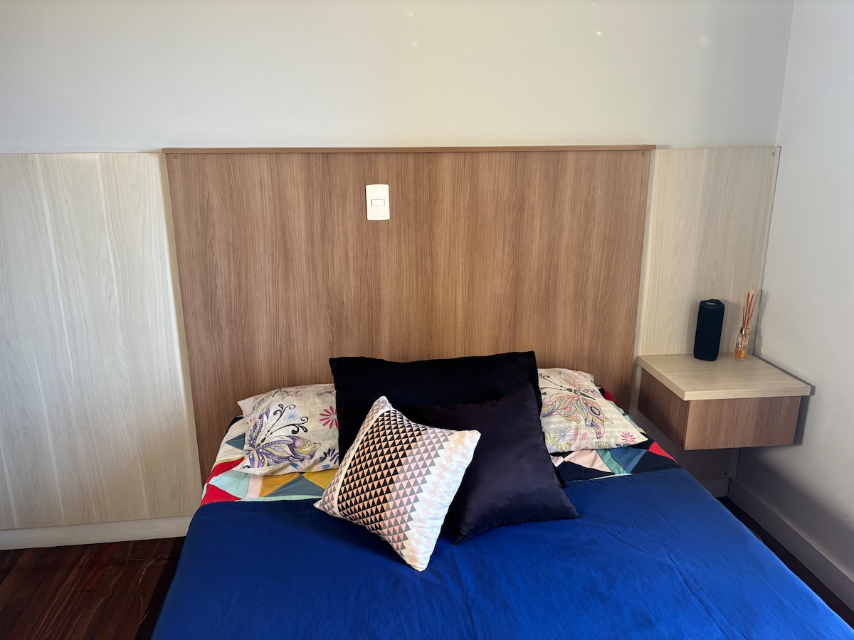Este espaço é bem aconchegante e acolhedor, com uma cama super confortável para descanso e uma ótima noite de sono, guarda roupa com cabides a disposição, possui uma cozinha compacta para fazer refeições com tranquilidade e de forma saudável, banheiro bem limpinho e organizado, ( necessário trazer produtos de banho e pasta de dente). O apartamento é super seguro, portaria 24h.