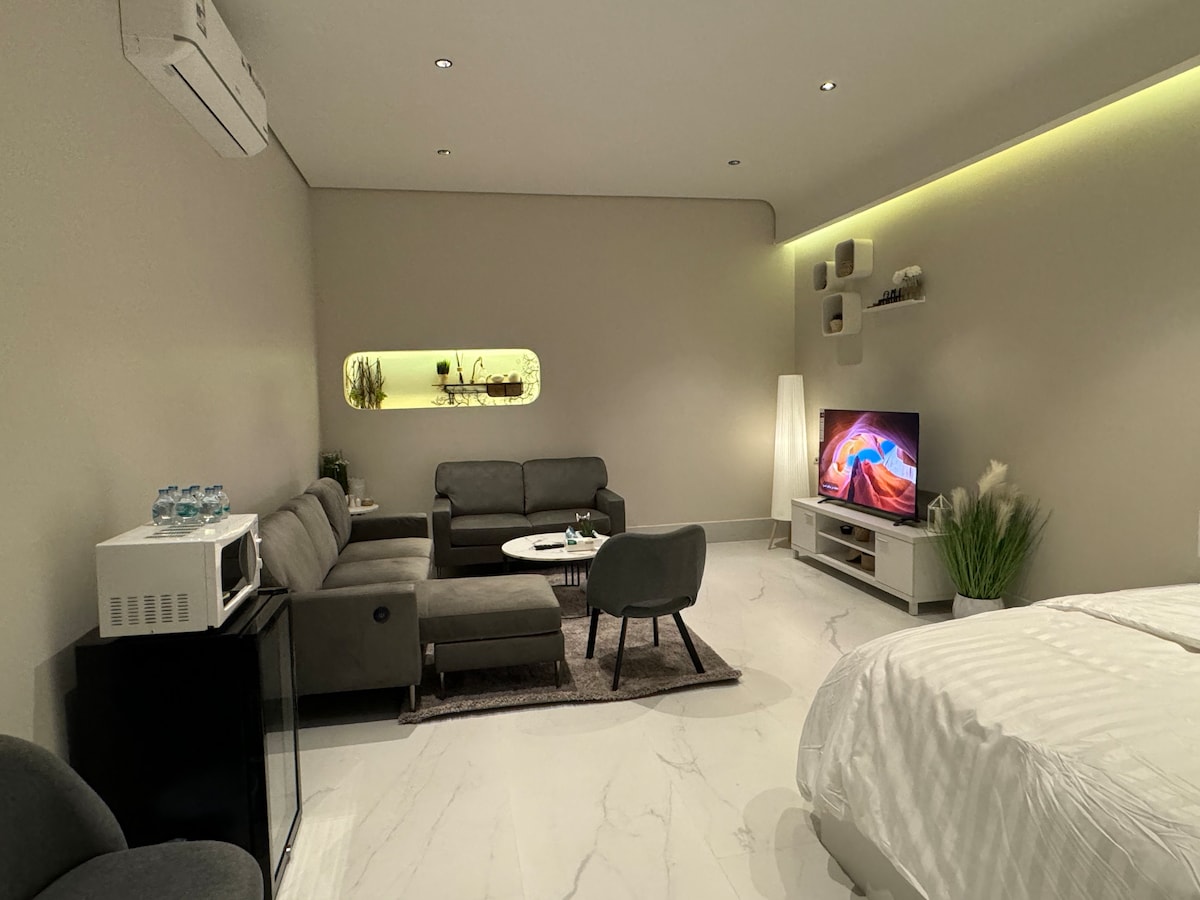 Μοντέρνο στούντιο ξενοδοχείου με ευρύχωρο χώρο σε μια ήσυχη γειτονιά. Άφιξη χωρίς παρουσία οικοδεσπότη + WiFi + ιατρικό στρώμα + υψηλής ποιότητας άνετος καναπές + γωνιά καφέ + παροχές ξενοδοχείου + πλήρως εξοπλισμένη κουζίνα. • Κεντρική τοποθεσία, 1 χιλιόμετρο από τον Βόρειο Περιφερειακό: • Αεροδρόμιο: 12 λεπτά • Οικονομική περιοχή: 15 λεπτά. • Riyadh Park, Nakheel και Granada Mall: 10–20 λεπτά • Riyadh Season & Boulevard: 15–20 λεπτά • Ιμάμης, Πριγκίπισσα Noura & e-University: 10–15 λεπτά ⚠️ Καθημερινός καθαρισμός σε στυλ ξενοδοχείου την ώρα που προτιμούν οι επισκέπτες.