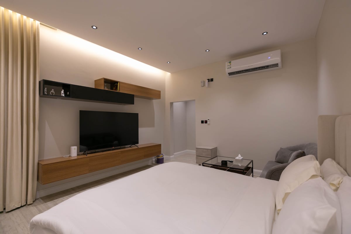 Μοντέρνο στούντιο ξενοδοχείου με ευρύχωρο χώρο σε μια ήσυχη γειτονιά. Άφιξη χωρίς παρουσία οικοδεσπότη + WiFi + ιατρικό στρώμα + υψηλής ποιότητας άνετος καναπές + γωνιά καφέ + παροχές ξενοδοχείου + πλήρως εξοπλισμένη κουζίνα. • Κεντρική τοποθεσία, 1 χιλιόμετρο από τον Βόρειο Περιφερειακό: • Αεροδρόμιο: 12 λεπτά • Οικονομική περιοχή: 15 λεπτά. • Riyadh Park, Nakheel και Granada Mall: 10–20 λεπτά • Riyadh Season & Boulevard: 15–20 λεπτά • Ιμάμης, Πριγκίπισσα Noura & e-University: 10–15 λεπτά ⚠️ Καθημερινός καθαρισμός σε στυλ ξενοδοχείου την ώρα που προτιμούν οι επισκέπτες.