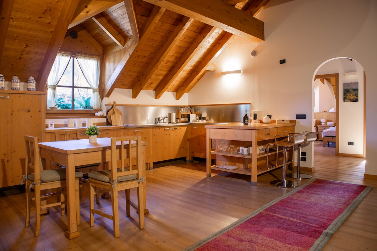 The Essence apartment is an open space with a double bed, a bathroom with a bathtub and shower, an equipped kitchen, a large balcony, and a veranda overlooking the house's garden. The wooden floor and the wood stove in the center of the living area convey the warmth of the environment. A cozy and intimate atmosphere for a relaxing and rejuvenating stay.