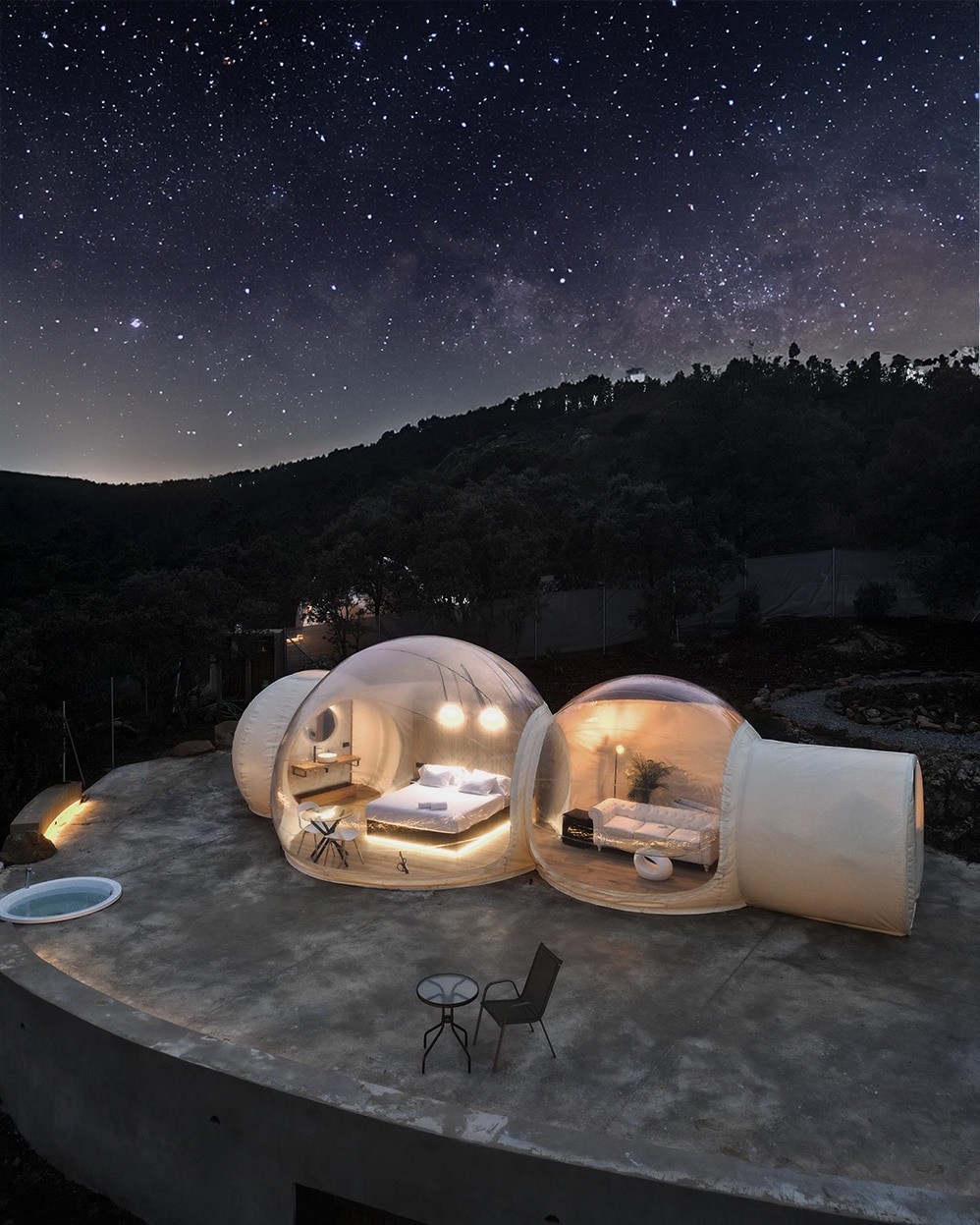 Φανταστείτε μια μαγική γωνιά στη μέση της φύσης, όπου ο έναστρος ουρανός είναι το ταβάνι του δωματίου σας. Ένας χώρος με σουίτες-φυσαλίδες, που περιβάλλεται από βουνά, δάση ή ένα φυσικό τοπίο που προσφέρει απομόνωση και ξεκούραση. Οι σουίτες-φυσαλίδες έχουν σχεδιαστεί για να συγχωνεύονται με το περιβάλλον χωρίς να θυσιάζουν την άνεση. Είναι διαφανείς σφαίρες με ένα μπαλινέζικο κρεβάτι, απαλά σεντόνια και αμυδρό φωτισμό που δημιουργεί μια ζεστή ατμόσφαιρα. Όλες οι σουίτες περιλαμβάνουν ιδιωτικό μπάνιο και υδρομασάζ εξωτερικού χώρου.