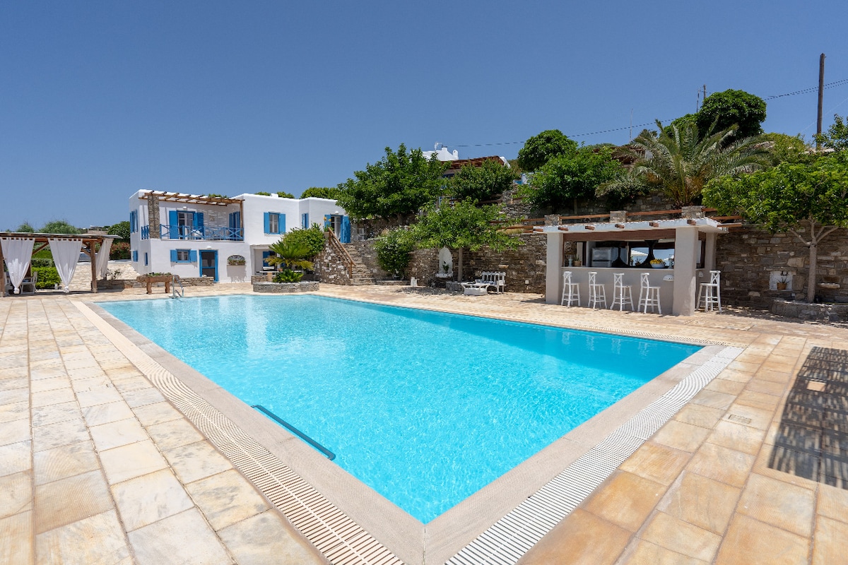 Αυτή η ελληνική βίλα βρίσκεται λίγο έξω από την Παροικία, προσφέροντας μια χαλαρωτική ατμόσφαιρα, ιδιωτικότητα και έναν αυθεντικό ελληνικό τρόπο ζωής. Η βίλα έχει δομημένη επιφάνεια 220 τ.μ. και πολύ μεγάλη εξωτερική αυλή. Διαθέτει ανεμπόδιστη θέα στη θάλασσα. Το κατάλυμα διαθέτει ιδιωτική μίνι πισίνα (χωρίς θέρμανση) με τρία καθίσματα υδρομασάζ. Η πισίνα έχει τραπεζοειδές σχήμα, με τη μία πλευρά να έχει μήκος 3,80 μέτρα και την απέναντι πλευρά 2 μέτρα. Το μήκος της είναι 5,60 μέτρα και το μέγιστο βάθος είναι 1,50 μέτρα.