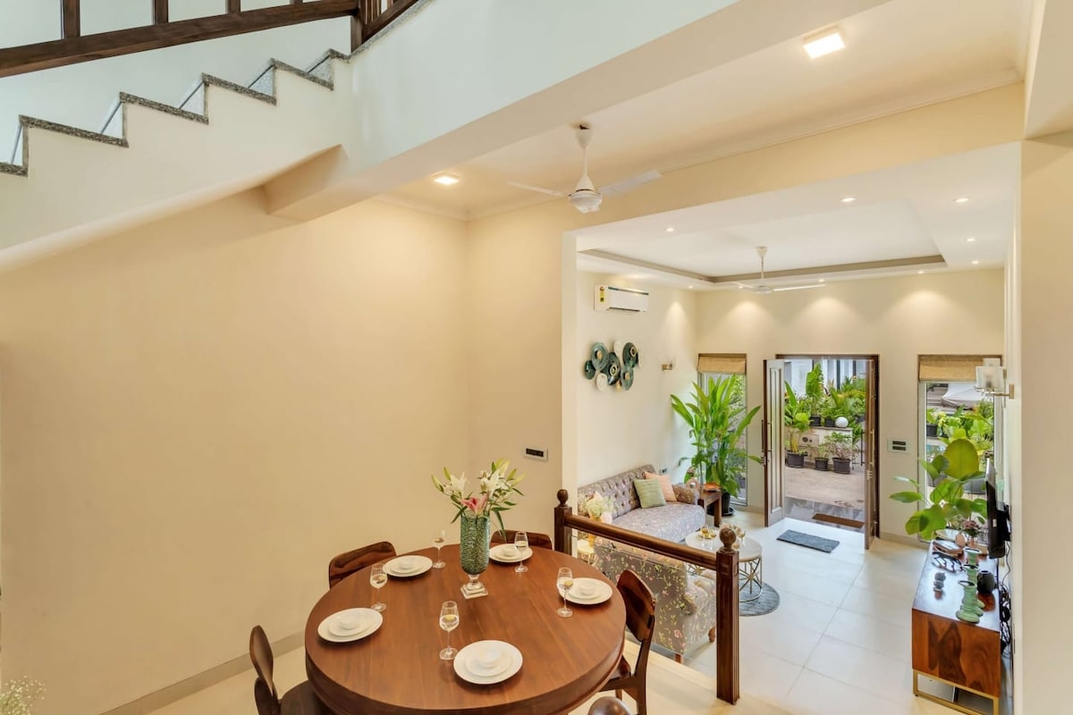 Αυτό το όμορφο σπίτι βρίσκεται σε κεντρική τοποθεσία σε μια πολυτελή κλειστή κοινότητα κοντά στο Siolim. Ιδανικό για φίλους ή οικογένειες. Υπάρχει πλούσιο πράσινο σε ολόκληρη την κοινότητα και επίσης ένας ιδιωτικός κήπος που περιβάλλει όλο το σπίτι! Χαλαρώστε στην πισίνα την ημέρα και χαλαρώστε με μερικές παγωμένες μπύρες στον ιδιωτικό μας κήπο το βράδυ! Το σπίτι απέχει μόλις 10-15 λεπτά από δημοφιλή εστιατόρια όπως το Thalassa, το Soro, το Gunpowder, το Jamun κ.λπ. 15-20 λεπτά με το αυτοκίνητο από δημοφιλείς παραλίες όπως η Vagator, η Anjuna, η Morjim, η Ozran κ.λπ.