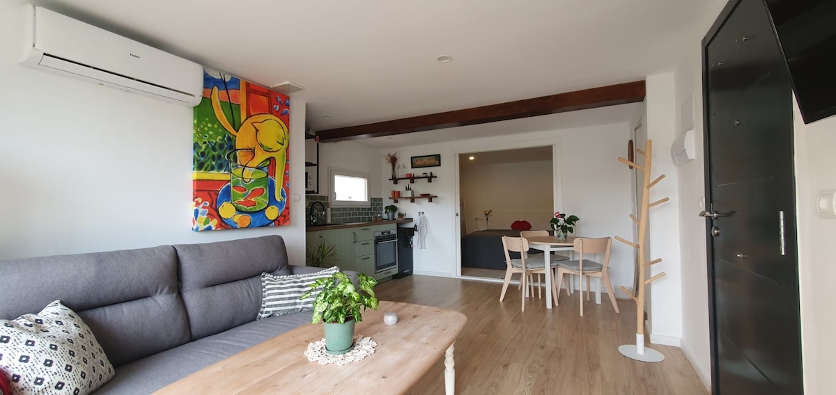 Estudio tranquilo, elegante, con acceso independiente, piscina y sauna privadas. Gran terraza cubierta chillout con barbacoa y mesa de billar semi-pro. Gran jardín-2 niveles, frutales, olivo centenario y breakfast corner Viñedos a 5' a pie. Playa y estación de tren a solo 15'. Autobús directo al centro de BCN a 5'. 20' si vas en coche Escondite con clase y encanto en casa privada en el hermoso pueblo de Alella, D.O con producción de vino desde los tiempos romanos. Chef ofrece comidas gourmet