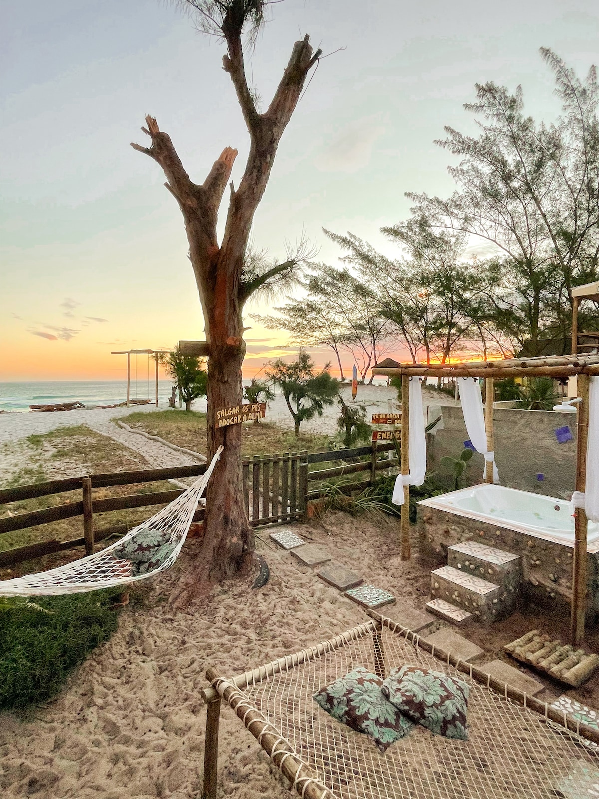 Όμορφο σαλέ, πάνω στην άμμο, μπροστά από την υπέροχη γαλάζια θάλασσα και το ηλιοβασίλεμα του Arraial do Cabo. Απολαύστε τις βεράντες μας, πάνω και κάτω, με εκπληκτική θέα, σε ένα χαλαρωτικό περιβάλλον. Το σαλέ μας είναι καλοφτιαγμένο, διακοσμημένο με απλό στυλ και είναι εξοπλισμένο με κουζίνα με σκεύη. Βρισκόμαστε 6,5 χιλιόμετρα, 13 λεπτά, από το αεροδρόμιο του Cabo Frio-RJ. Το σαλέ βρίσκεται στο Μόντε Άλτο, ένα πολύ ήσυχο, απλό και ρουστίκ χωριό, 15 χιλιόμετρα από το Αραιάλ. Χαλαρώστε σε αυτόν τον ήρεμο και κομψό χώρο!