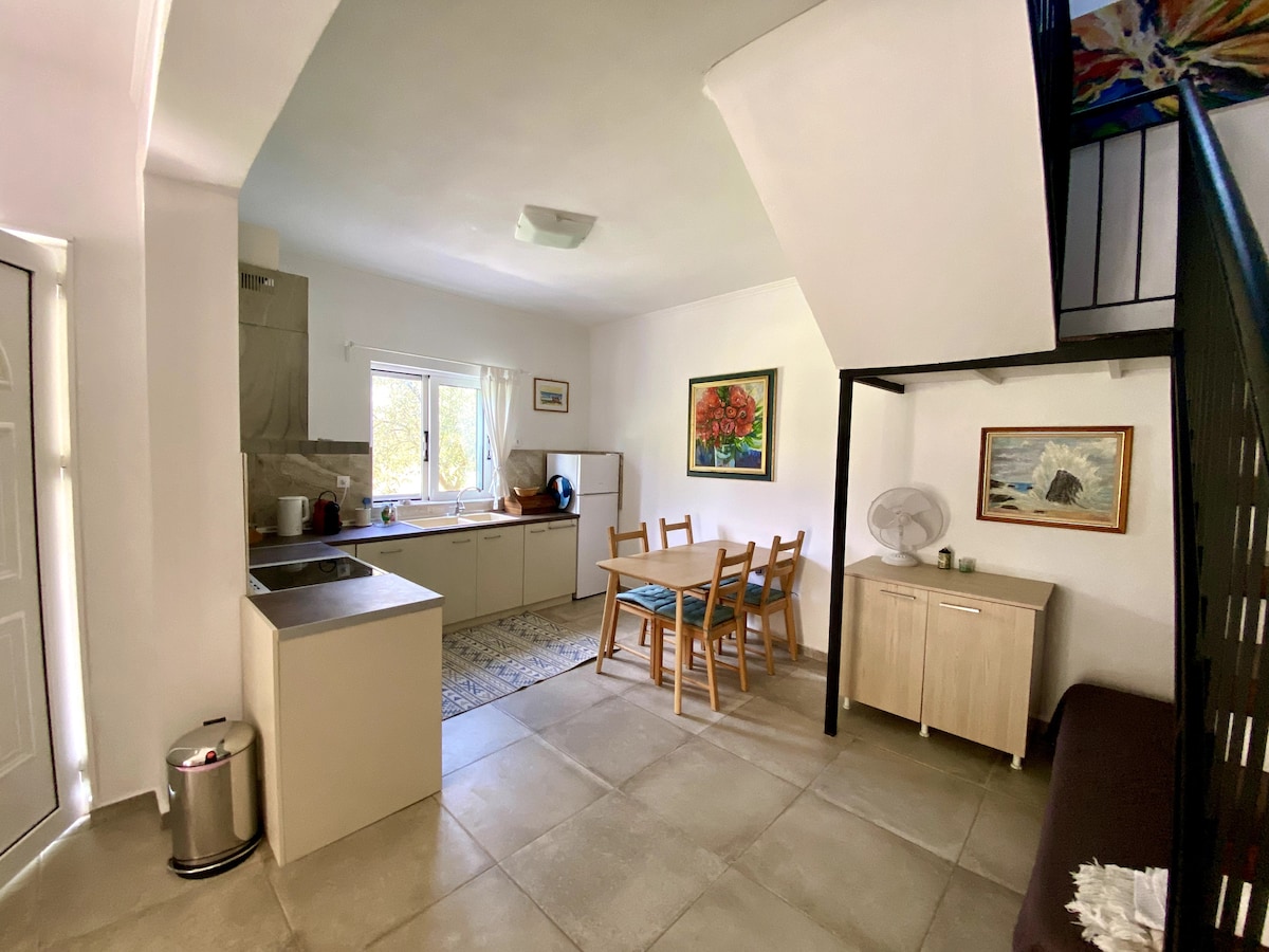 Villa Gyri is a brand new construction of 50sqm and it is comprised of 1 bedroom, 1 bathroom and an open plan kitchen/dining/living area, leading directly to the outdoor area where our guests will find a swimming pool, an outdoor shower, a barbeque area, an outdoor dining table, and sunbeds for lounging. This villa accommodates 2 adults and also 2 children as there is a sofa which can convert into a bed which sleeps 2. In the living room there is a 43' smart TV.