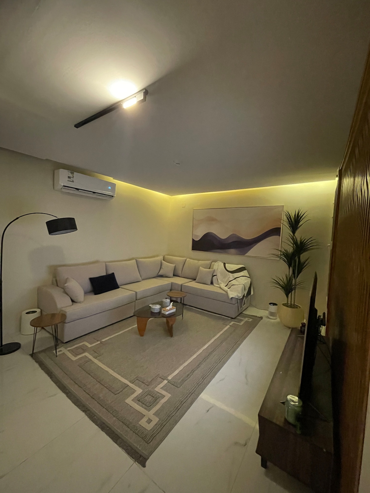 Ένα πολυτελές και κομψό διαμέρισμα με νέα αρχιτεκτονική και προνομιακή τοποθεσία με μια ήσυχη νύχτα με όλες τις όμορφες λεπτομέρειες για να περάσετε τις πιο όμορφες στιγμές Αποτελείται από ένα υπνοδωμάτιο, ντουλάπια αποθήκευσης και έναν καθαριστή αέρα με θέα σε έναν ζωντανό δρόμο, ένα ξεχωριστό σαλόνι με δωρεάν πρόσβαση στο διαδίκτυο και μια οθόνη 65 ιντσών με Samsung Sound Bar με ενεργοποιημένη συνδρομή Netflix, παρακολούθηση, YouTube και διάφορα προγράμματα Καλώς ήρθατε στους επισκέπτες μας.
