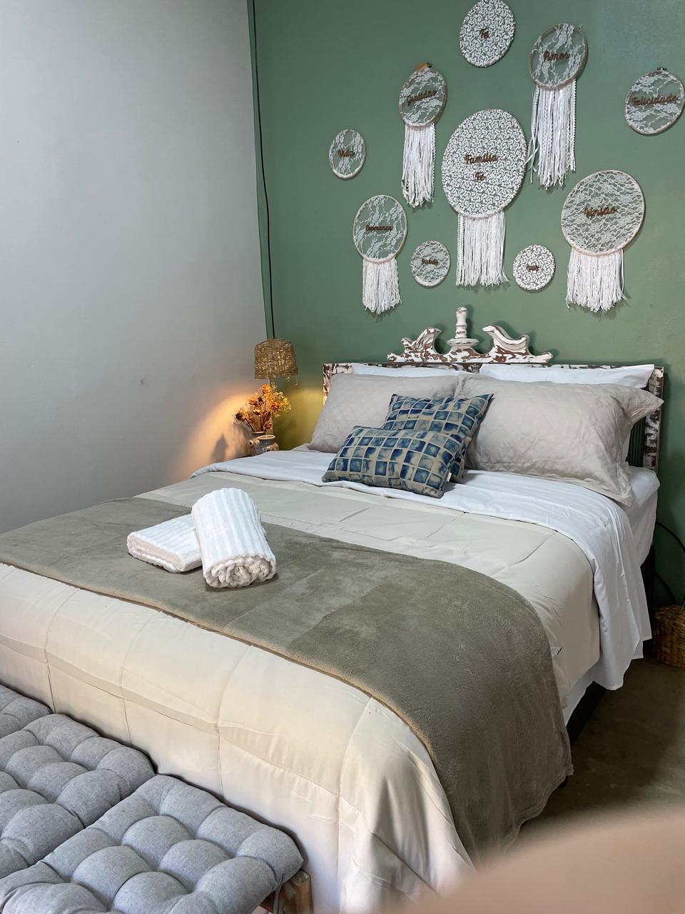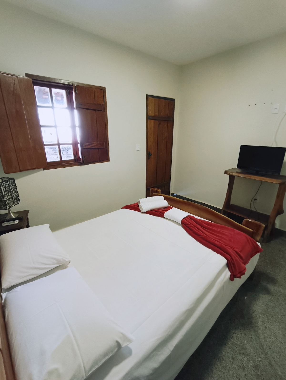 A Suíte do Bonfim conta com 1 cama tamanho Queen, frigobar, ar condicionado, arara, cortina blackout, lençóis de algodão, toalhas e varanda privativa com rede.