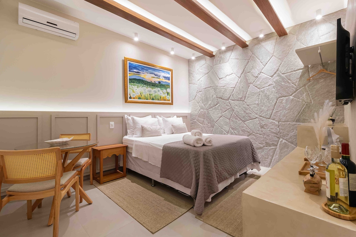 A suíte está equipada com ar condicionado, frigobar, TV e Wi-Fi.