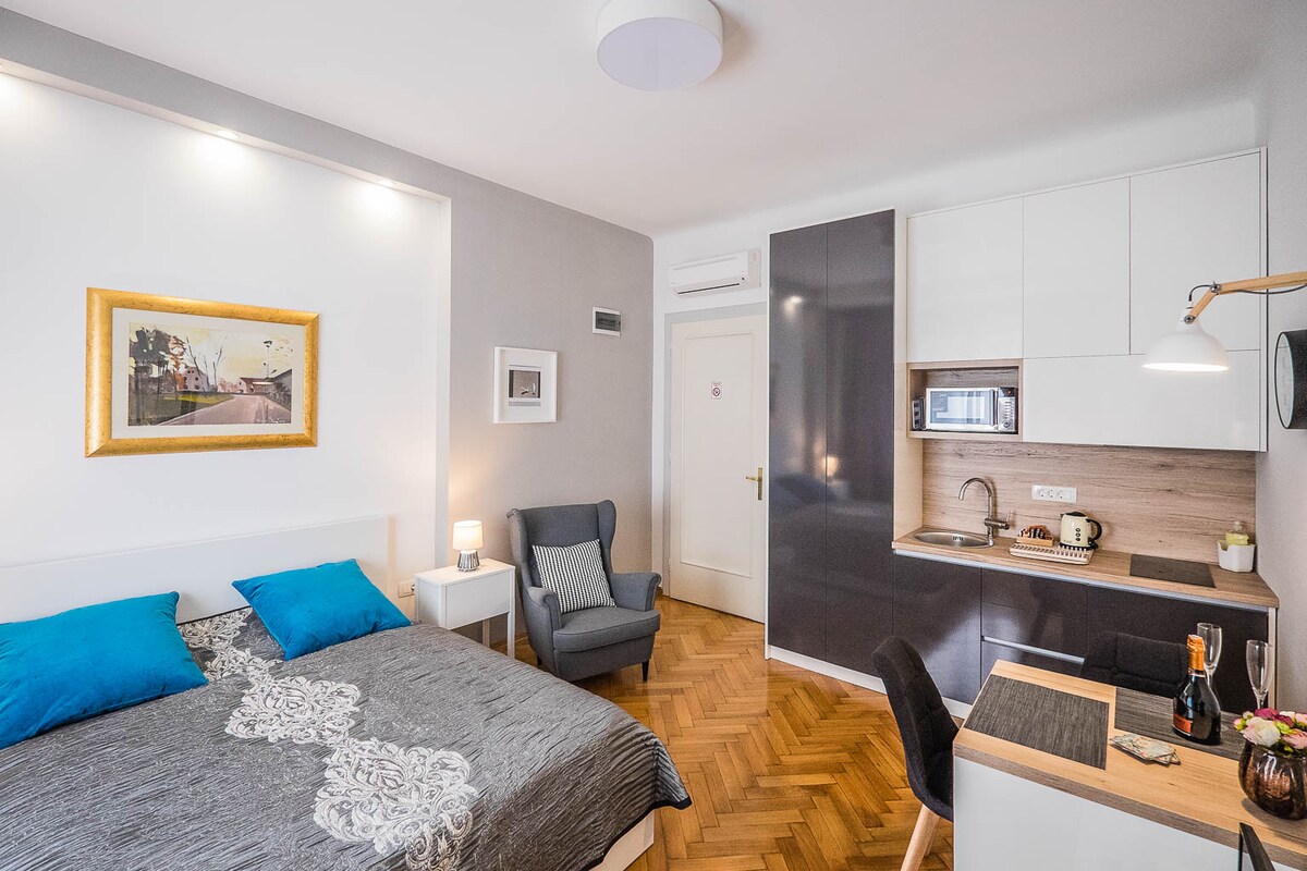 Εξοικονομήστε με αποκλειστικές εκπτώσεις έγκαιρης κράτησης ή τελευταίας στιγμής σε αυτό το επίσημα βαθμολογημένο διαμέρισμα στούντιο 4 αστέρων με κλιματισμό και μπαλκόνι! Σε ιδανική τοποθεσία σε έναν ήσυχο, κεντρικό δρόμο στο Ζάγκρεμπ — απολαύστε τα καλύτερα και των δύο κόσμων: την ηρεμία και τη ζωή στην πόλη. Φωτεινό, άνετο και ζεστό, με γρήγορο Wi-Fi για όλες τις ανάγκες σας. Η υπηρεσία πλυντηρίου είναι ακριβώς δίπλα και είμαστε πάντα ένα τηλεφώνημα μακριά για να κάνουμε τη διαμονή σας εύκολη και ευχάριστη.