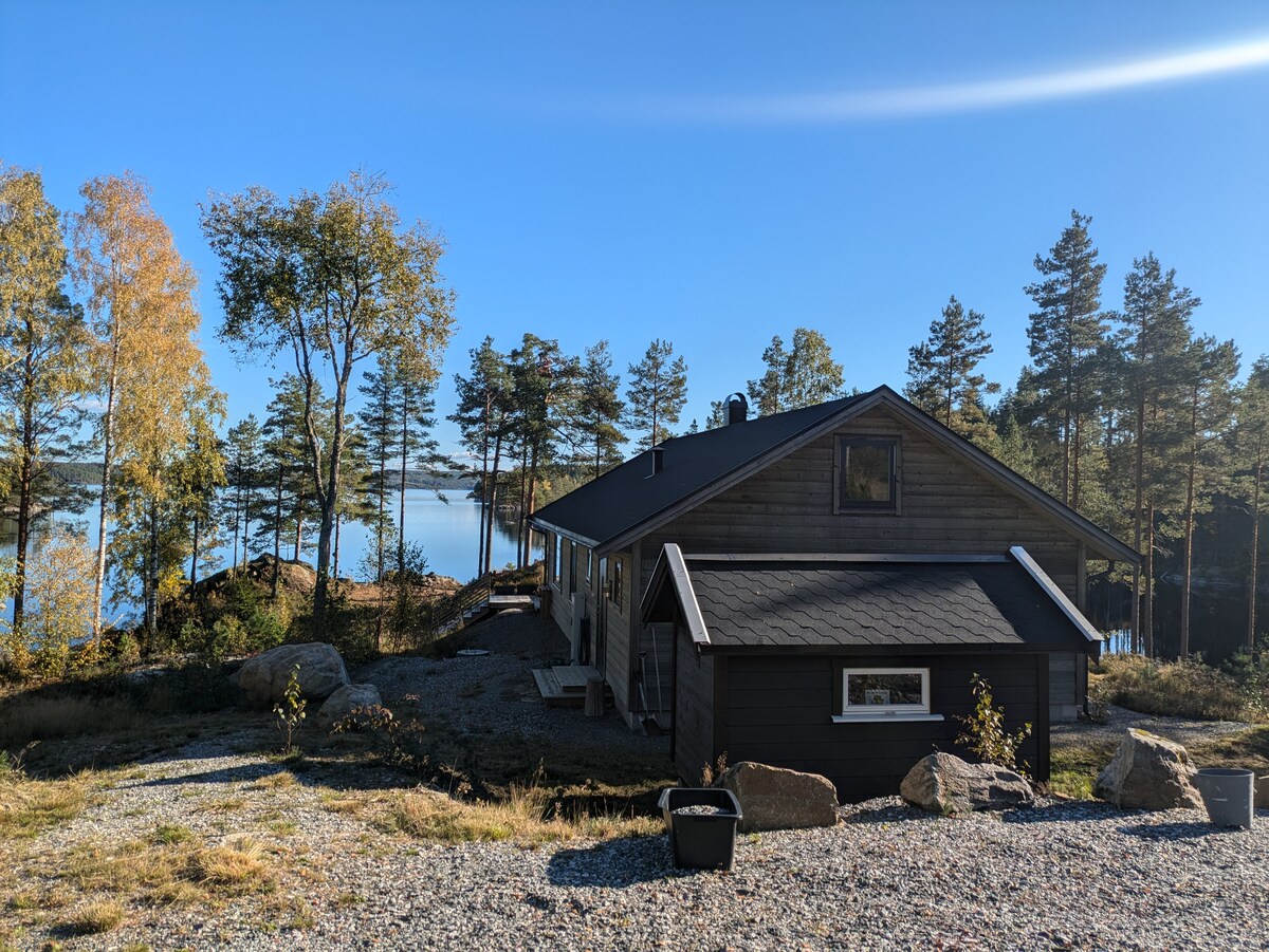 Vi leier ut en ny og moderne hytte . Det er 3 soverom, egner seg for 6 personer. Hytta har gode solforhold gjennom dagen. Det er et flott sted for late sommerdager med lange frokoster, en rusletur ned til badestranda for et bad, en rotur med en av båtene (som er fritt til utlån) Hytta er svært velegnet for familier, men også for voksne som vil nyte skogens ro. Det er mange fine turmuligheter, uteaktiviteter og fiskemuligheter på området.