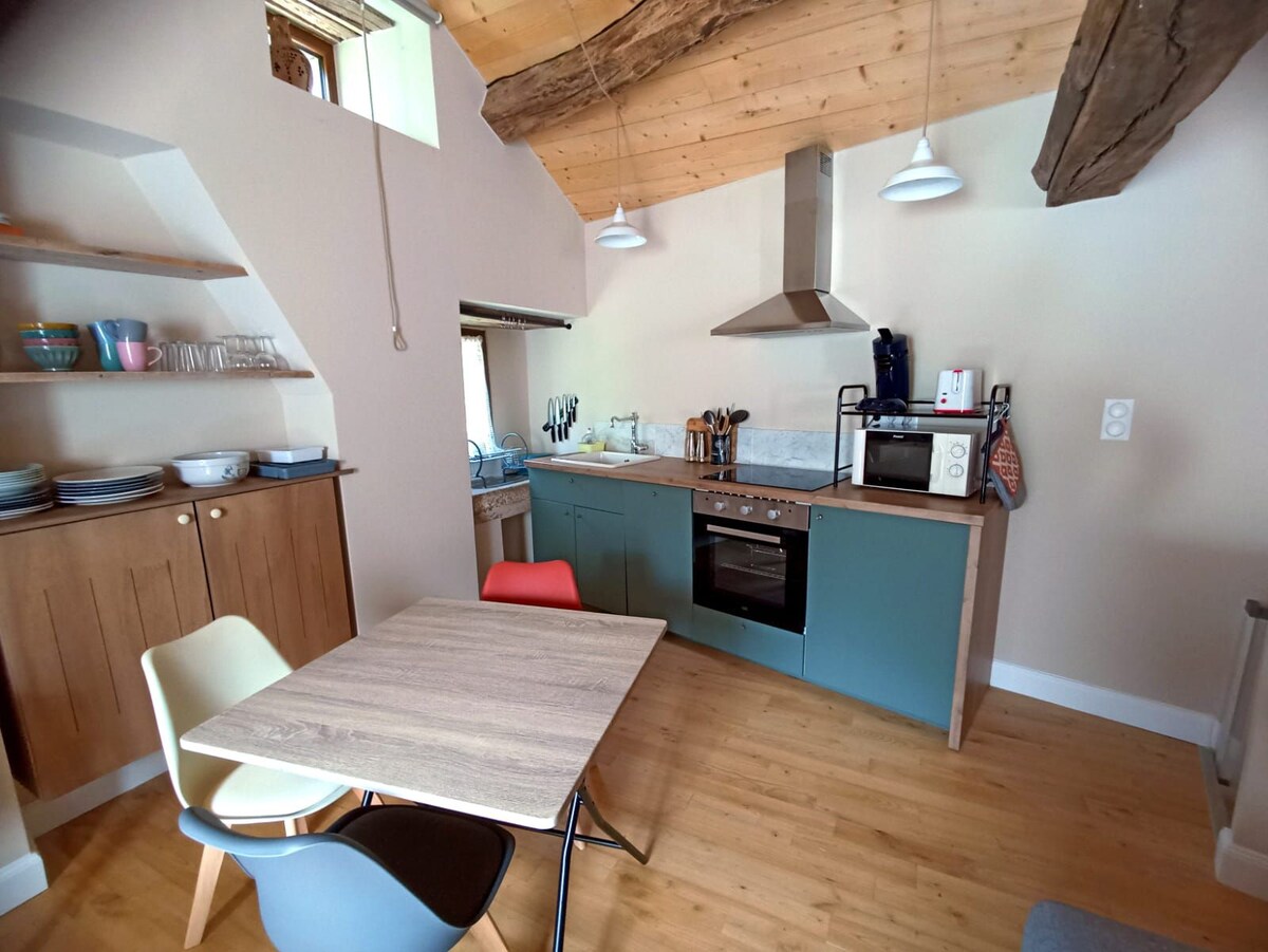 Γοητευτικό μικρό σπίτι 65 τ.μ. (χωρίς εξωτερικό χώρο) στην καρδιά του χωριού, κοντά σε όλες τις ανέσεις (παντοπωλείο, φούρνος, φαρμακείο, εστιατόριο,...) και ιδανικά τοποθετημένο στον δρόμο προς το St Jacques de Compostelle Μόνος/η, ως ζευγάρι, με συγγενείς ή φίλους (έως 6 κρεβάτια), ελάτε να ανακαλύψετε την όμορφη περιοχή μας και να μείνετε στο πρόσφατα ανακαινισμένο και διακοσμημένο σπίτι μας σε μποέμικο στιλ. Σαλόνι/τραπεζαρία με εντοιχισμένη κουζίνα 1 μεγάλο υπνοδωμάτιο, 1 ημιώροφος με πρόσβαση με σκάλα