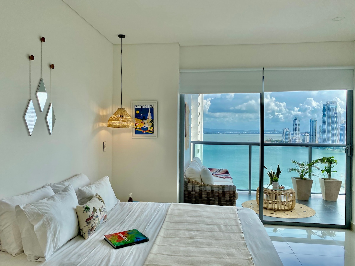 Αποκλειστικό διαμέρισμα στον 30ό όροφο Morros City με απίστευτη και μαγευτική θέα στη θάλασσα και το ιστορικό κέντρο. Κύριο υπνοδωμάτιο με άμεση θέα στη θάλασσα και πρόσβαση στο μπαλκόνι. Πλήρης κουζίνα, πλυντήριο και στεγνωτήριο 2 σε 1, έξυπνη τηλεόραση 60", WiFi 500MB με οπτικές ίνες. Παραθαλάσσιο Bocagrande με πολυτελείς παροχές: πισίνα, τζακούζι, τουρκικό λουτρό και γυμναστήριο. Δωρεάν πάρκινγκ. Ιδανικό για ζευγάρια που αναζητούν την πιο αποκλειστική εμπειρία από τον υψηλότερο διαθέσιμο όροφο σε όλη την Καρταχένα.