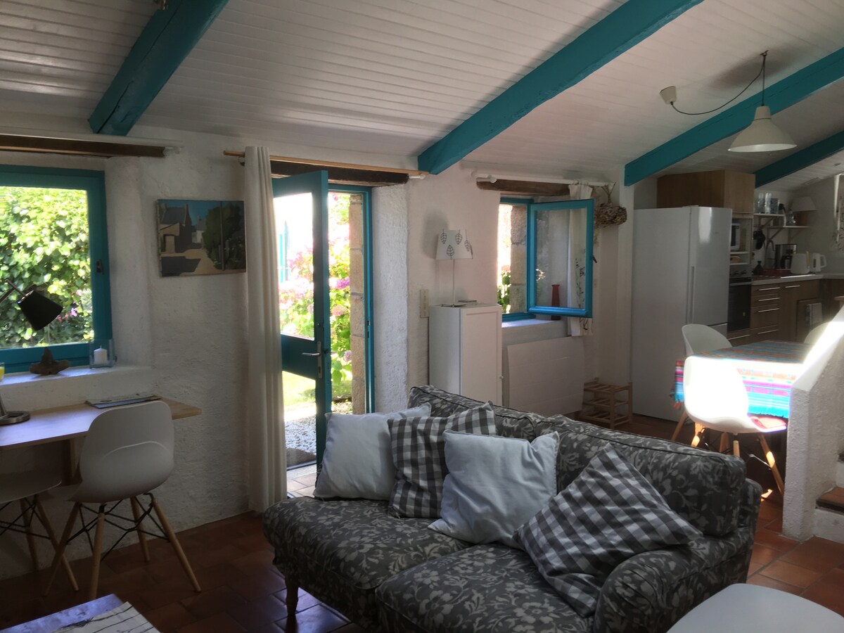 "Cap à l 'Ouest" Θαλάσσια, φωτεινή και ιωδιαμερισμένη ατμόσφαιρα για αυτόν τον ανακαινισμένο αχυρώνα που βρίσκεται σε ιδιωτική αυλή που περιβάλλεται από αγροτόσπιτα Breton. Μικρή παραλία 50 μέτρα μακριά. Η βεράντα βρίσκεται στην αυλή. Δεν υπάρχει κήπος, αλλά ένας όμορφος χώρος με την παραλία ακριβώς δίπλα.