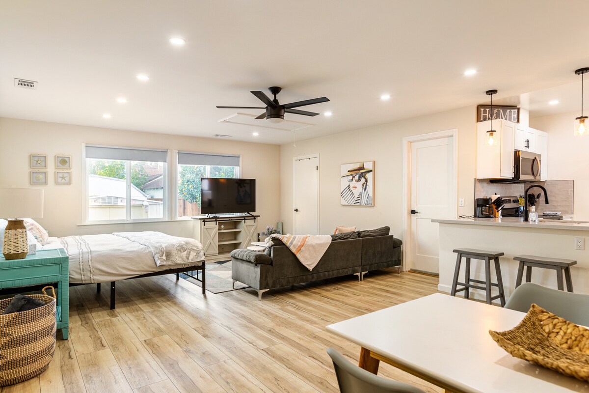 Καλώς ήρθατε στο χαλαρωτικό καταφύγιό σας! Αυτό το φιλόξενο ιδιωτικό στούντιο προσφέρει έναν συνδυασμό άνεσης και ευκολίας, ιδανικό για μεμονωμένους ταξιδιώτες ή ζευγάρια που αναζητούν μια ήρεμη απόδραση. Απολαύστε έναν ξεκούραστο ύπνο στο άνετο κρεβάτι queen size, ενώ το φουτόν πλήρους μεγέθους προσφέρει επιπλέον χώρο για να καθίσετε ή να κοιμηθείτε. Χαλαρώστε με τις αγαπημένες σας εκπομπές στην τηλεόραση του δωματίου ή βγείτε έξω για να χαλαρώσετε στην όμορφη, κοινόχρηστη πίσω αυλή, ένα γαλήνιο μέρος για να ξεκινήσετε το πρωί σας ή να χαλαρώσετε το βράδυ.