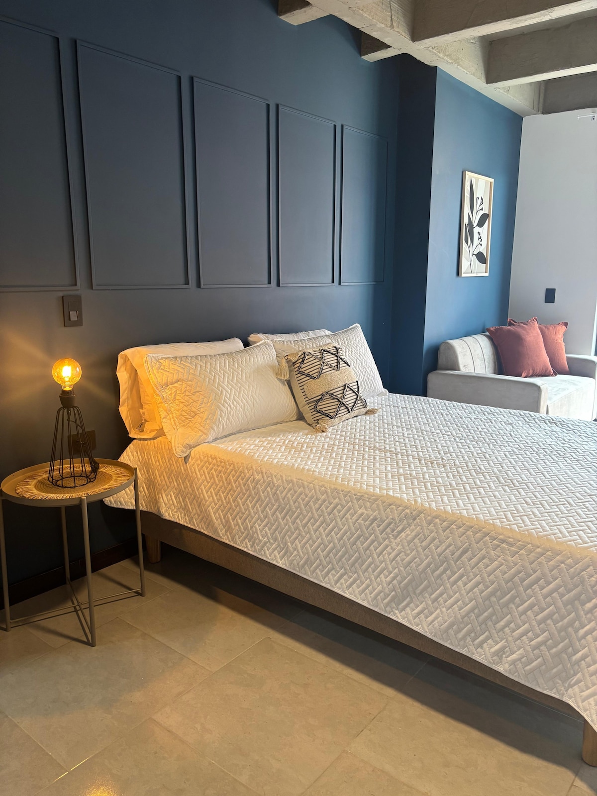 Con un amplio espacio de 23m2, cuenta con una acogedora alcoba, una zona de entretenimento perfecta para relajarte, un balcón para disfrutar de una espléndida vista, cocina equipada, un cómodo escritorio para trabajar; amplio vestier para organizar tus pertenencias, lencería de calidad y un baño completo para tu comodidad. Cuenta con cajilla de seguridad, plancha y mesa para planchado.