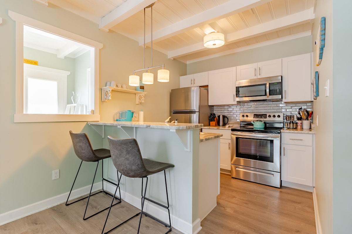 Αξιολάτρευτο εξοχικό 2 υπνοδωματίων, 2 μπάνιων (Σουίτα Α-6 άτομα) με σκεπαστή μπροστινή βεράντα που ΒΡΙΣΚΕΤΑΙ 320 μέτρα από την ΠΑΡΑΛΊΑ. Απολαύστε αυτό το πλήρως ανακαινισμένο σπίτι που διαθέτει μοντέρνα κουζίνα με συσκευές SS και πάγκους από γρανίτη μαζί με κεντρικό κλιματισμό, WIFI, πλυντήριο/στεγνωτήριο και όλα τα βασικά σας είδη πρώτης ανάγκης. Απολαύστε το τραπέζι σας σε εξωτερικό χώρο μαζί με την ψησταριά με κάρβουνα. Κατάλληλο και για αμαξίδια γκολφ! Σε κεντρική τοποθεσία και λίγα λεπτά από εστιατόρια, τοπικά ψώνια και δραστηριότητες. Καλώς ήρθατε, χιονισμένα πουλιά! Επιτρέπουμε 1 μικρό σκυλί που είναι 25 λίβρες