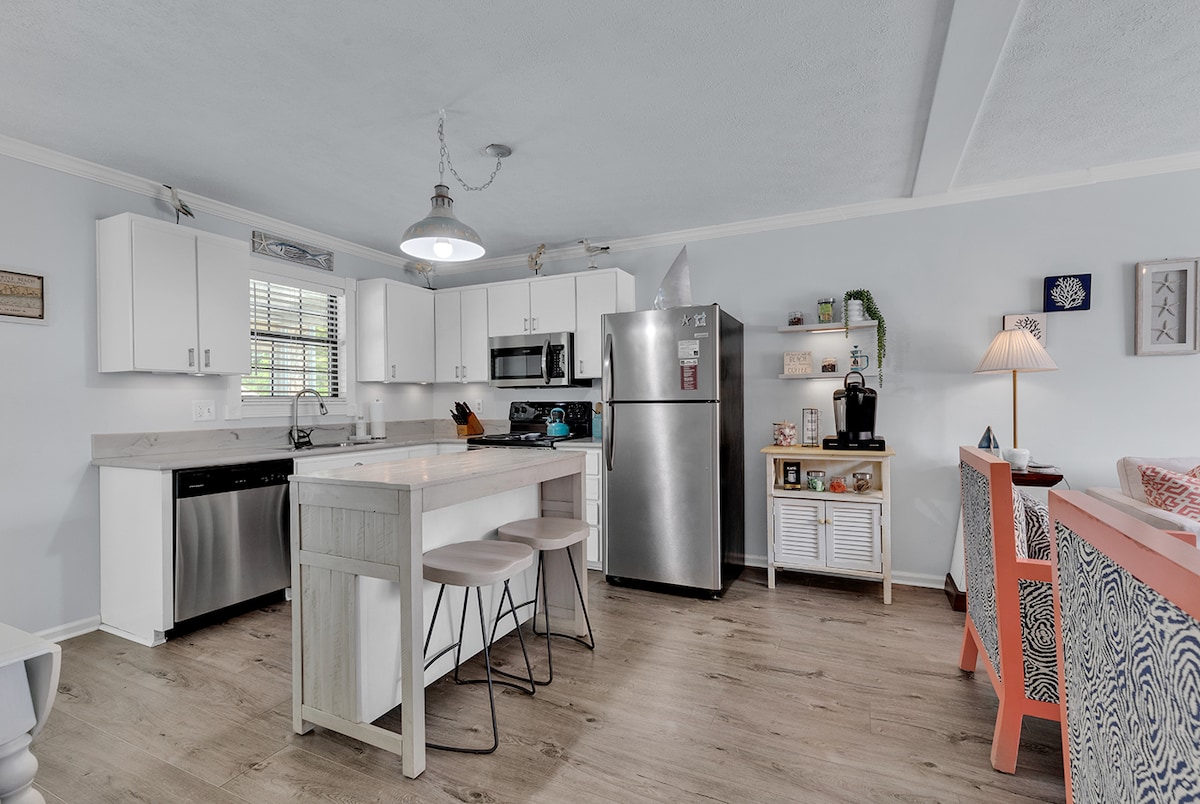 Adorable 1 Bedroom, 1 Bath Cottage (Suite D Sleeps 4) LOCATED 320 Yards from the BEACH. Enjoy this completely remodeled home that Boasts Modern Kitchen W/ SS Appliances & Granite Counters along with Central Air, WIFI, Washer/Dryer & all your basic necessities. Enjoy your outdoor table along with Charcoal Grill -- Golf Cart Friendly too! Centrally located & minutes to restaurants, local shopping & activities. Pull out couch sleeps an additional 2 people.Snow birds welcome! We do allow 1 small