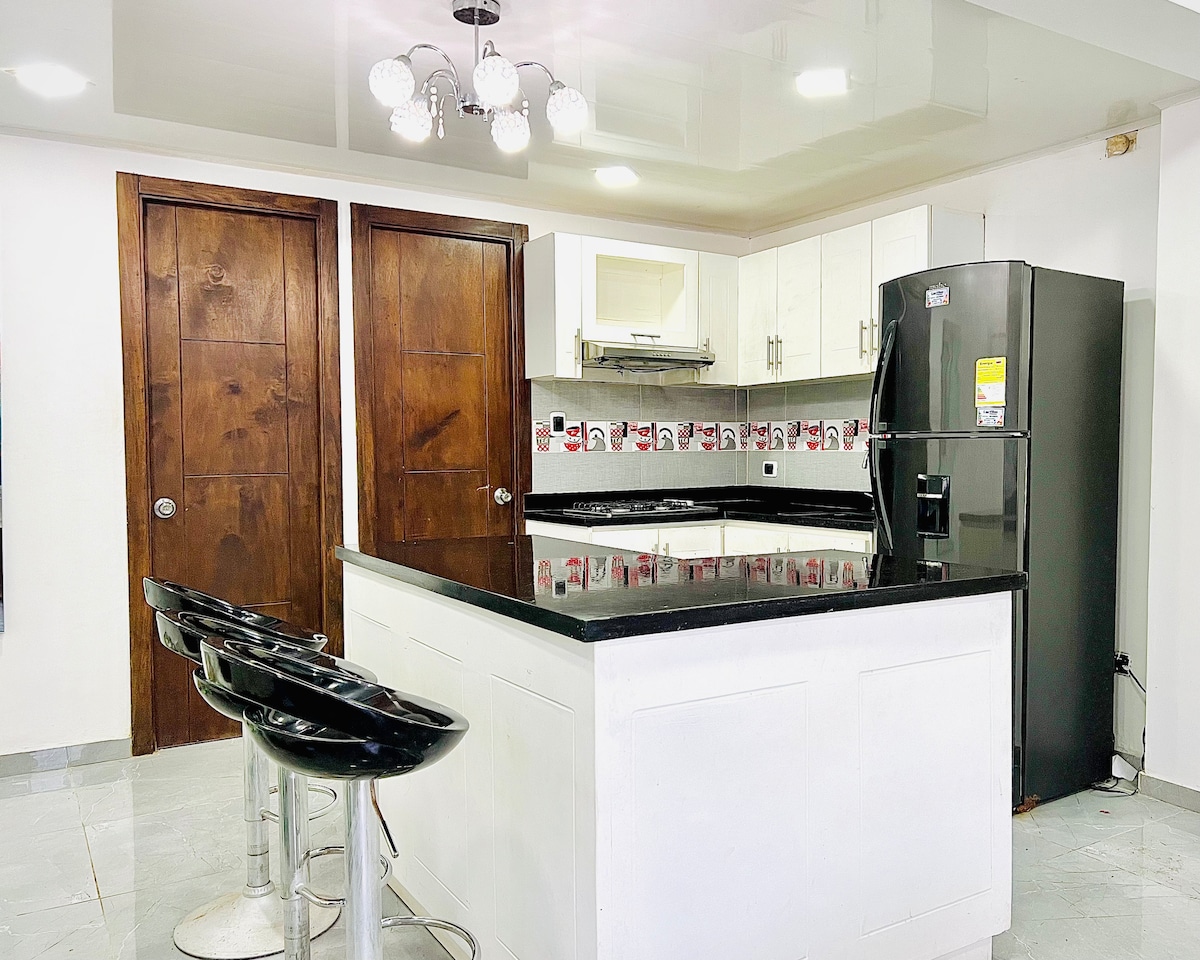 Απολαύστε ένα μοντέρνο και άνετο διαμέρισμα στη Μπαρανκίγια με εξαιρετική τοποθεσία, ιδανικό για επαγγελματικά ταξίδια, ξεκούραση ή διακοπές. Διαθέτει 2 υπνοδωμάτια, 2 μπάνια, κλιματισμό, εξοπλισμένη κουζίνα και Wi-Fi υψηλής ταχύτητας. Με έξυπνη τηλεόραση και προβολέα για μια εμπειρία home cinema. Βρίσκεται 8 λεπτά με αυτοκίνητο από το εμπορικό κέντρο Mall Plaza και μόλις 5 λεπτά με τα πόδια από το εμπορικό κέντρο Miramar. Θα βρείτε επίσης ένα σνακ μπαρ με εξαιρετικές τιμές.