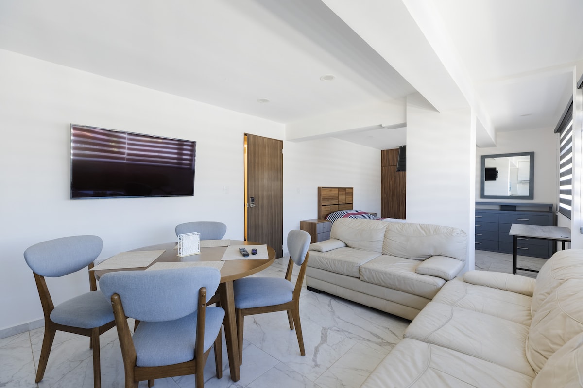 Bright, modern high-rise space on the 18th floor with open city views. Ideal for couples, friends, and relaxed longer stays 3 Queen beds for up to 6 guests Equipped kitchen Large-capacity washer and dryer machine Electric blinds and high-speed Wi-Fi for home office Enjoy a 24/7 GYM, rooftop, and in-building parking for 2 cars Pet-friendly building with security service and 24/7 security cameras Quick access to Cholula (5 min away), Angelópolis (8 min away), and key attractions